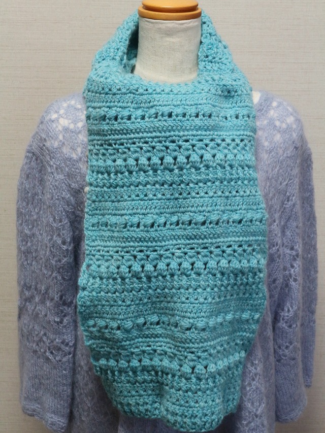 《特徴》ターコイズ・ブルー・グリーン3色のメリノウールで編んだ手編みのマフラーです。 このマフラーのメインテーマは、ズバリ!『テキスチャー』です!編み地のテキスチャーが美しくでるように、かぎ針の8種類の編み方で編みました。 (くさり編み 長編み 細編み 長編一目交差 引上編み 玉編み 長編みヘリンボーン※ 綿あめ編み※・・・ ※はアトリエふじさくら独自の編み方です。 ) 使用した毛糸はウールの中でも高品質なメリノウールです。肌に優しい素材ですので、安心してお使いいただける素材です。 幅もたっぷりあるロングマフラーですので、いろいろな巻き方を楽しんでいただくことができます。 《使用素材》 100%メリノウールの毛糸3色(ターコイズ・ブルー・グリーン) 《技法》 かぎ針編み。 《長さ》 幅 約23〜25センチ 長さ 約160センチ 《送料》無料 ヤマト運輸の宅配便で送ります。 丁寧に手編みで編んでお作りしておりますが、ハンドメイド特有の形の歪み等ある場合がございます。あらかじめご了承ください。