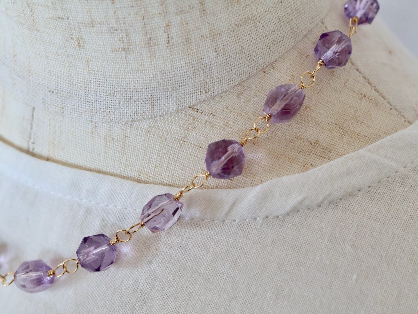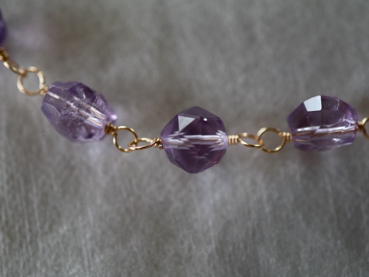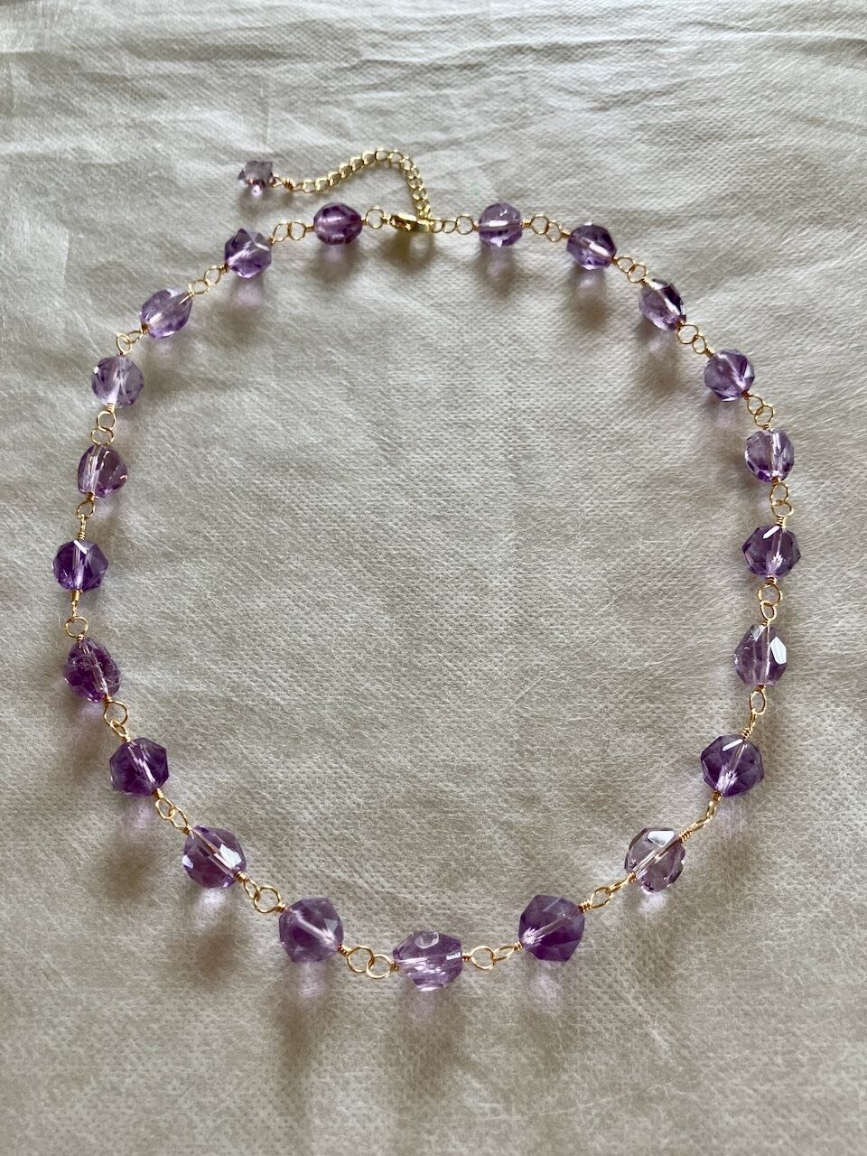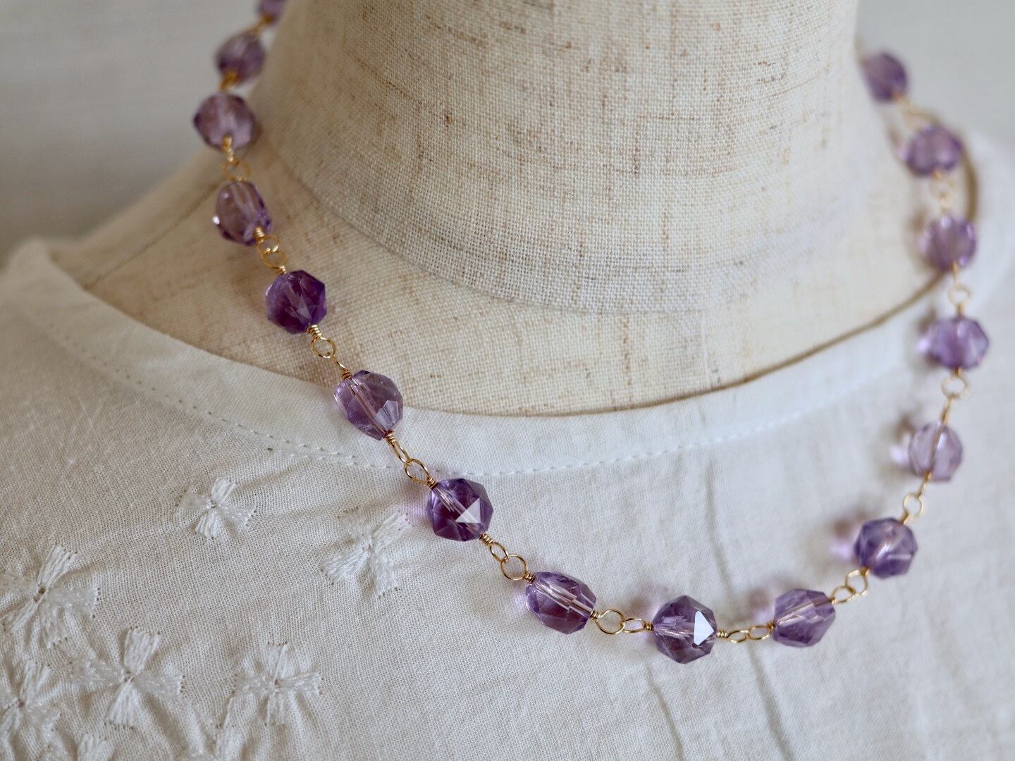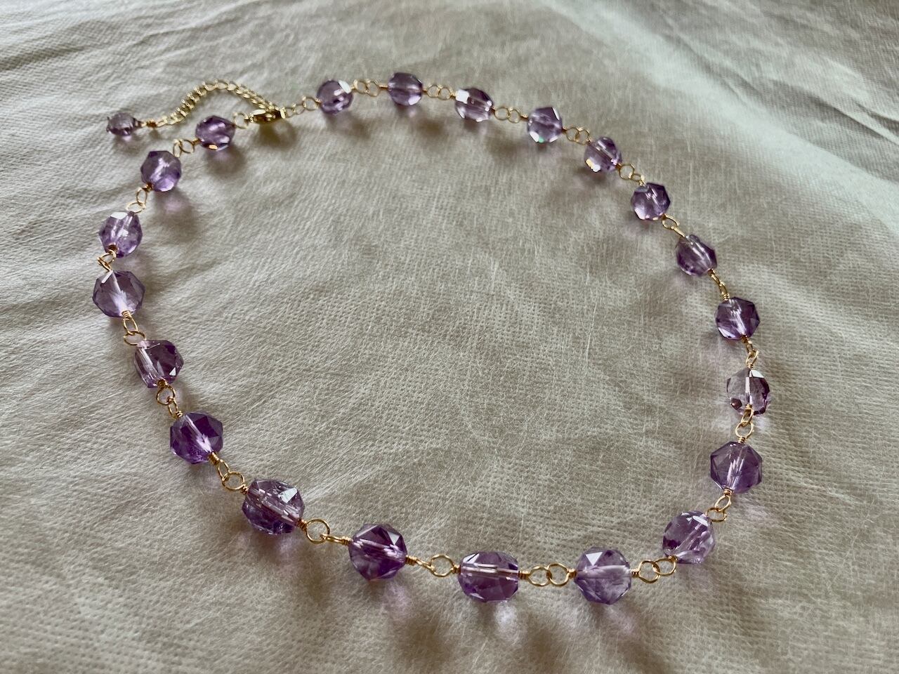 透明感あふれる宝石質のアメジストをワイヤーでつないで作ったショートネックレスです。