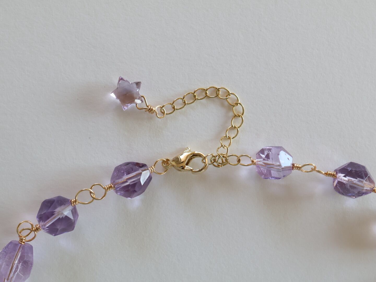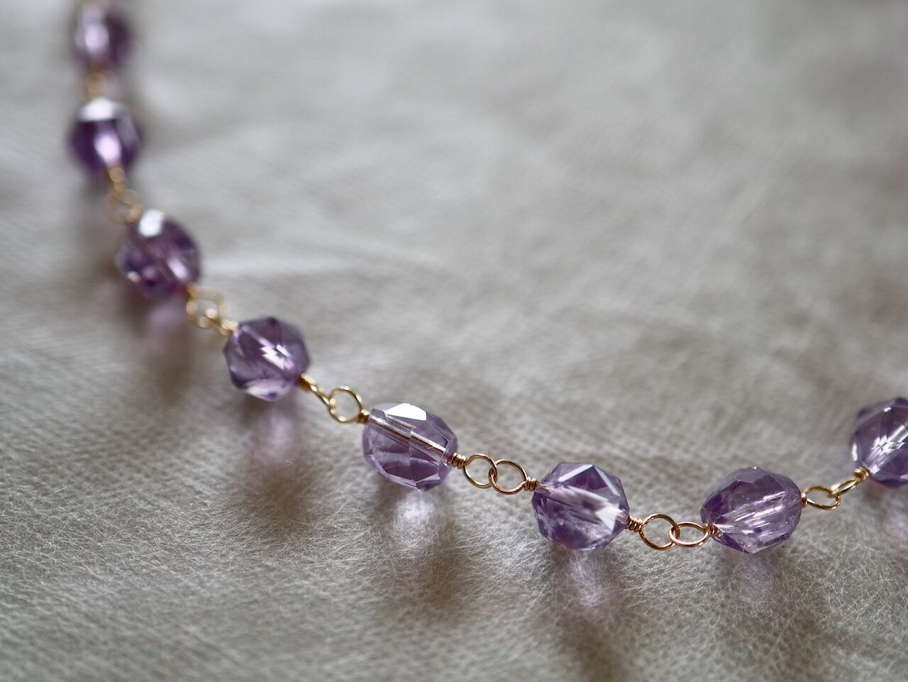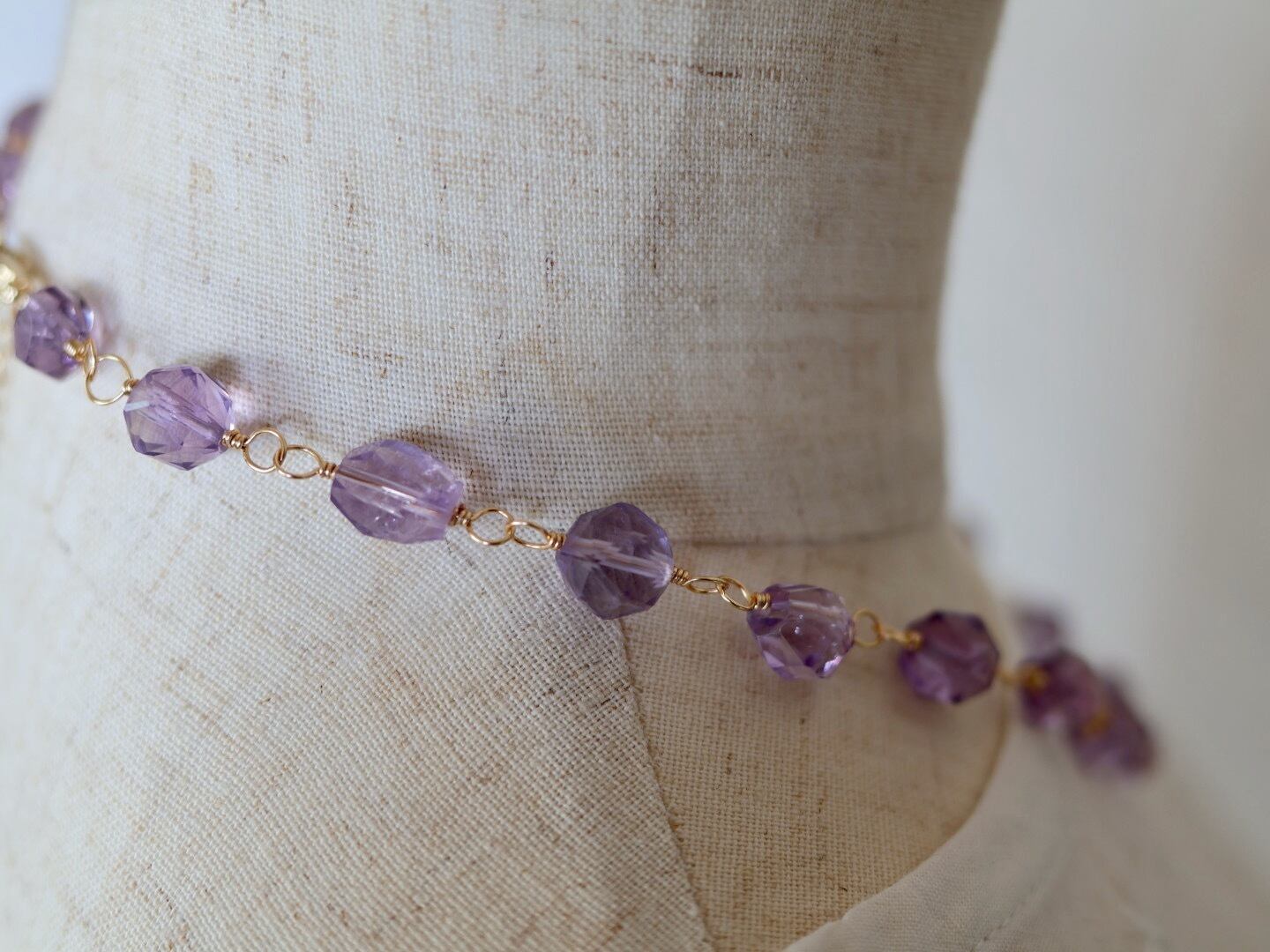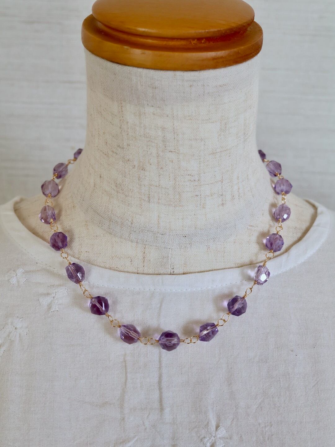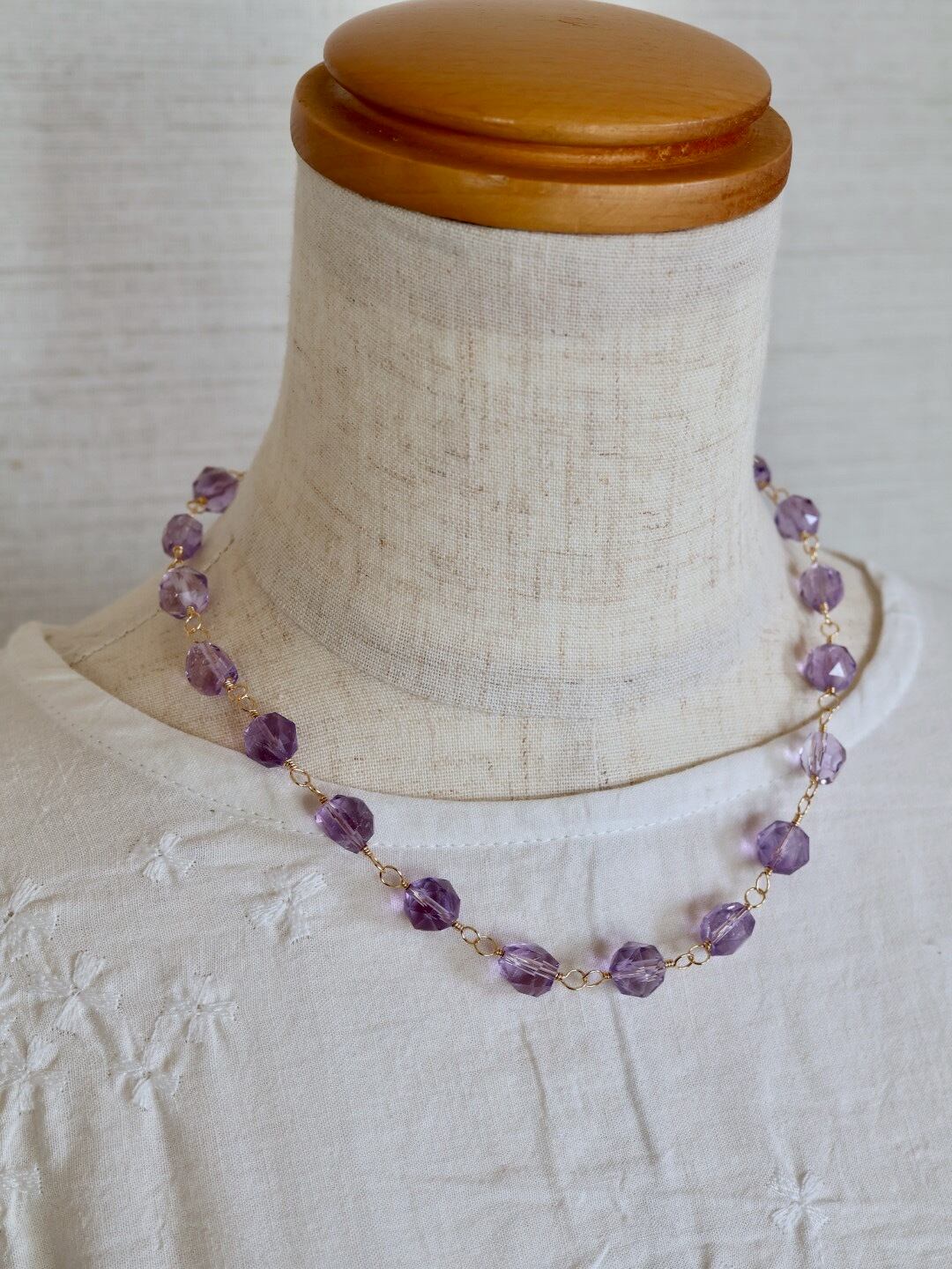 透明感あふれる宝石質のアメジストをワイヤーでつないで作ったショートネックレスです。