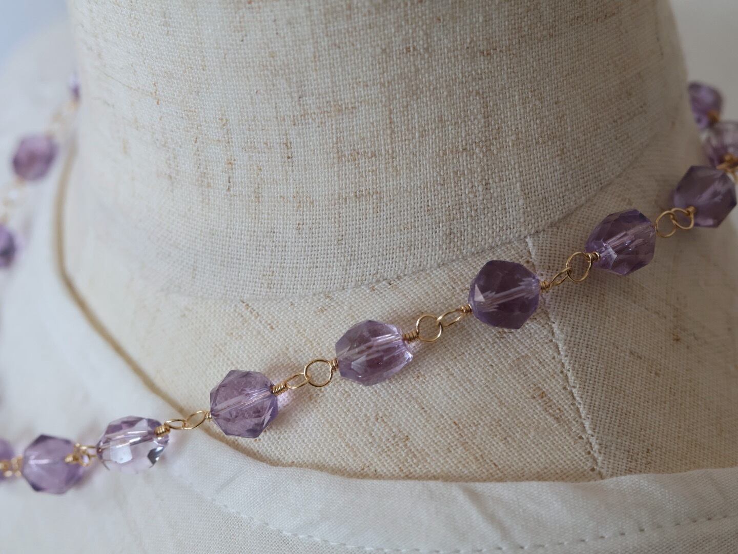 タンブル形にカッティングされたアメジストは、ひとつひとつ表情豊かで、存在感のあるネックレスに仕上がっております。