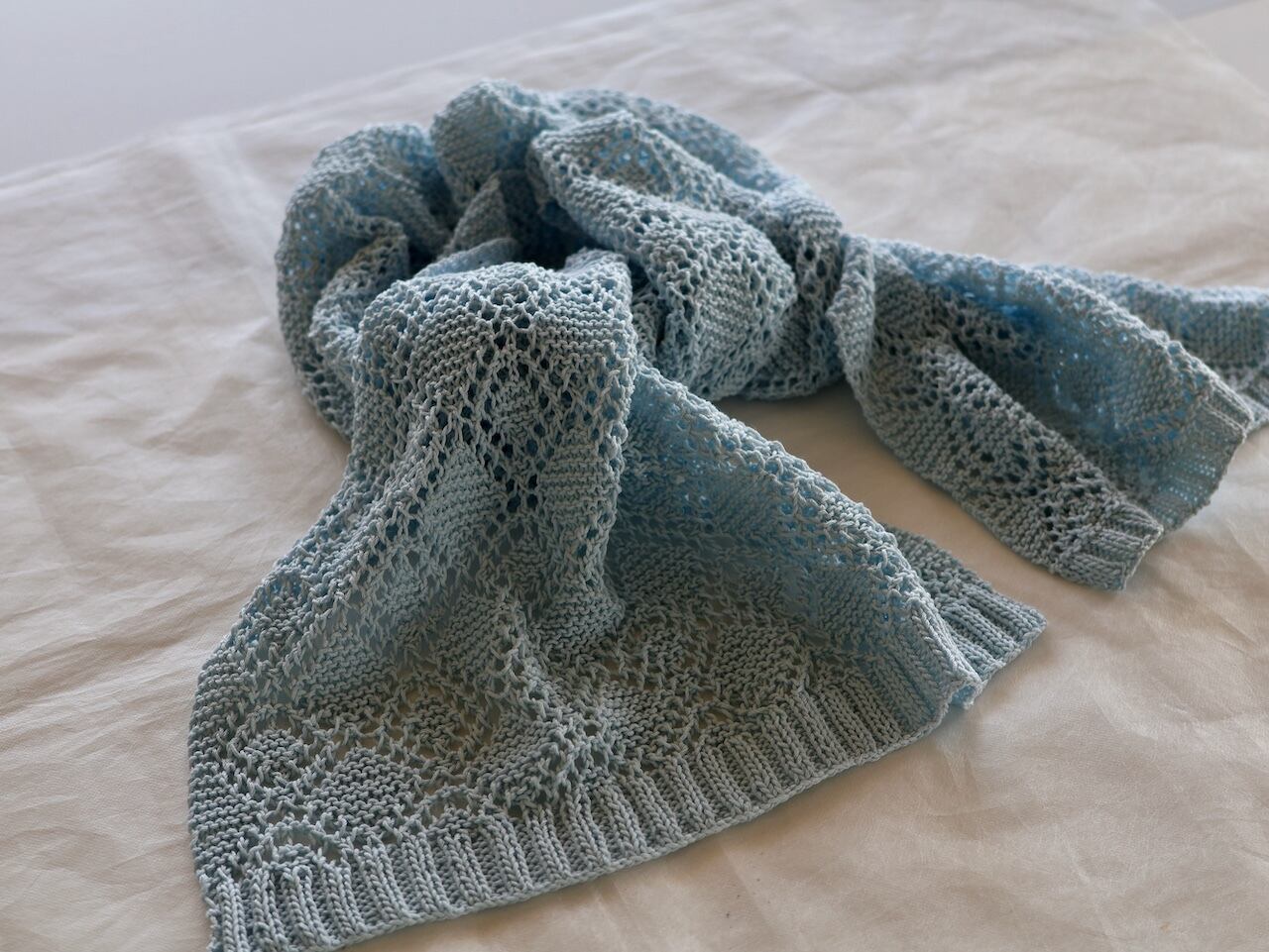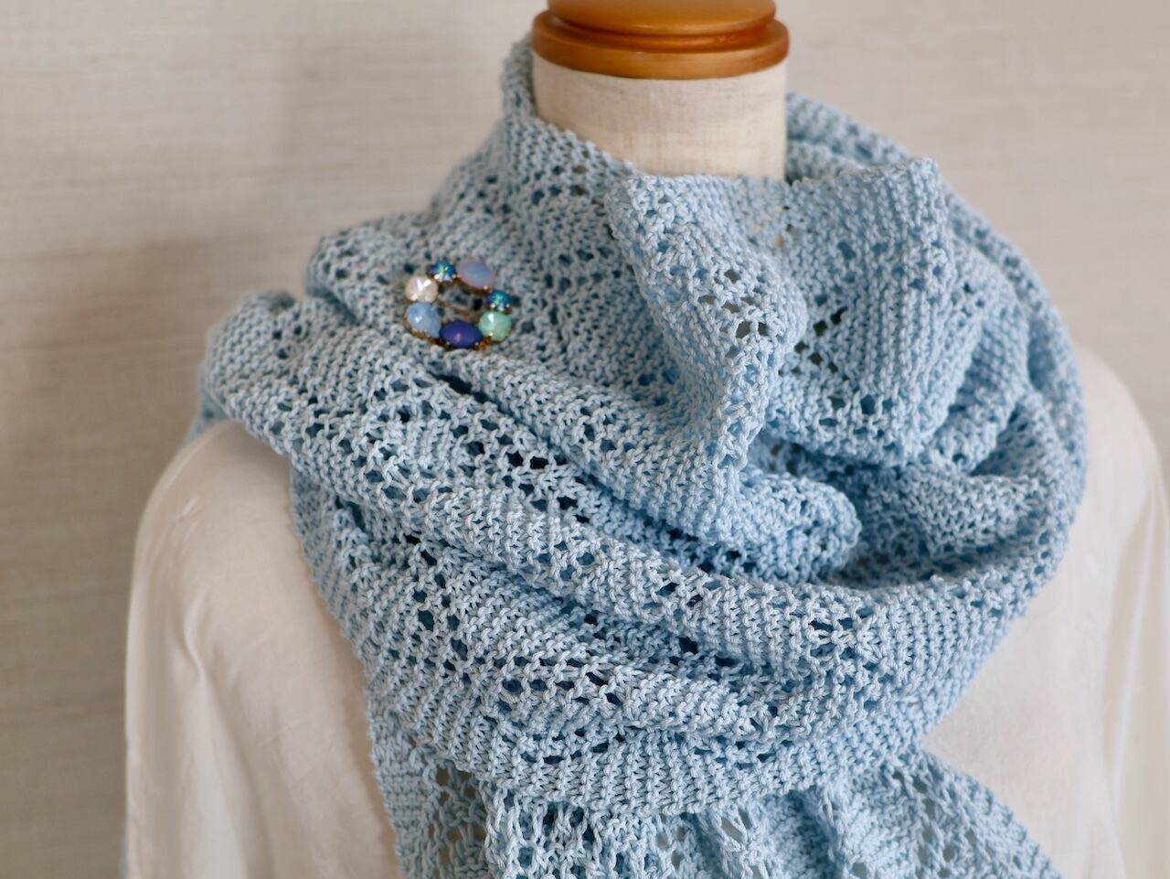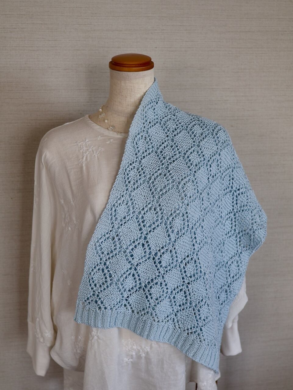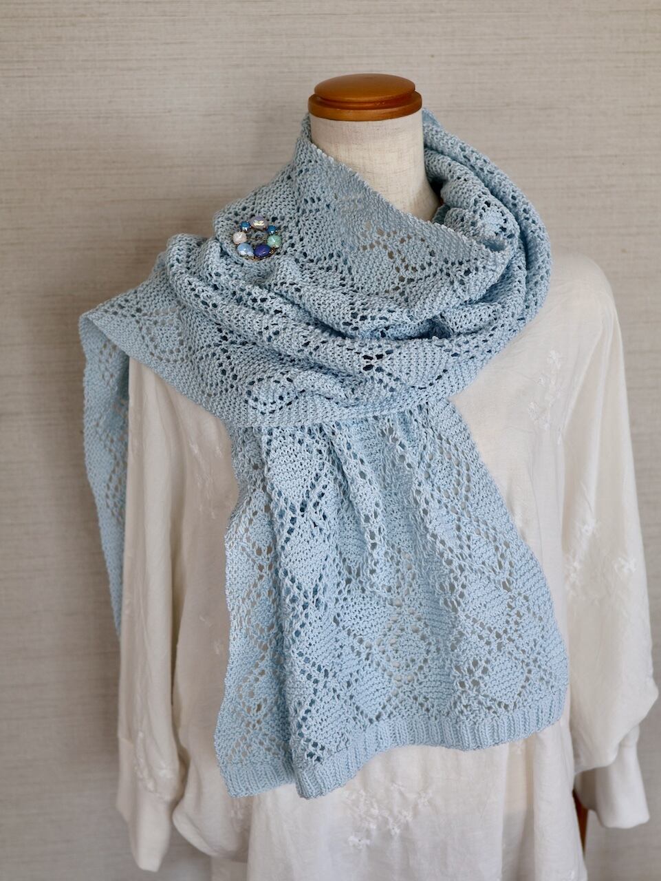 綿の中でも最高品質のスーピマコットンから作られた日本製のコットン糸を、シェットランドレース風の編み方で編んだストールです。