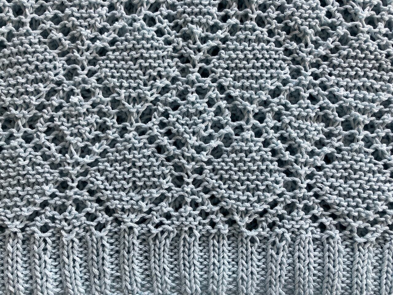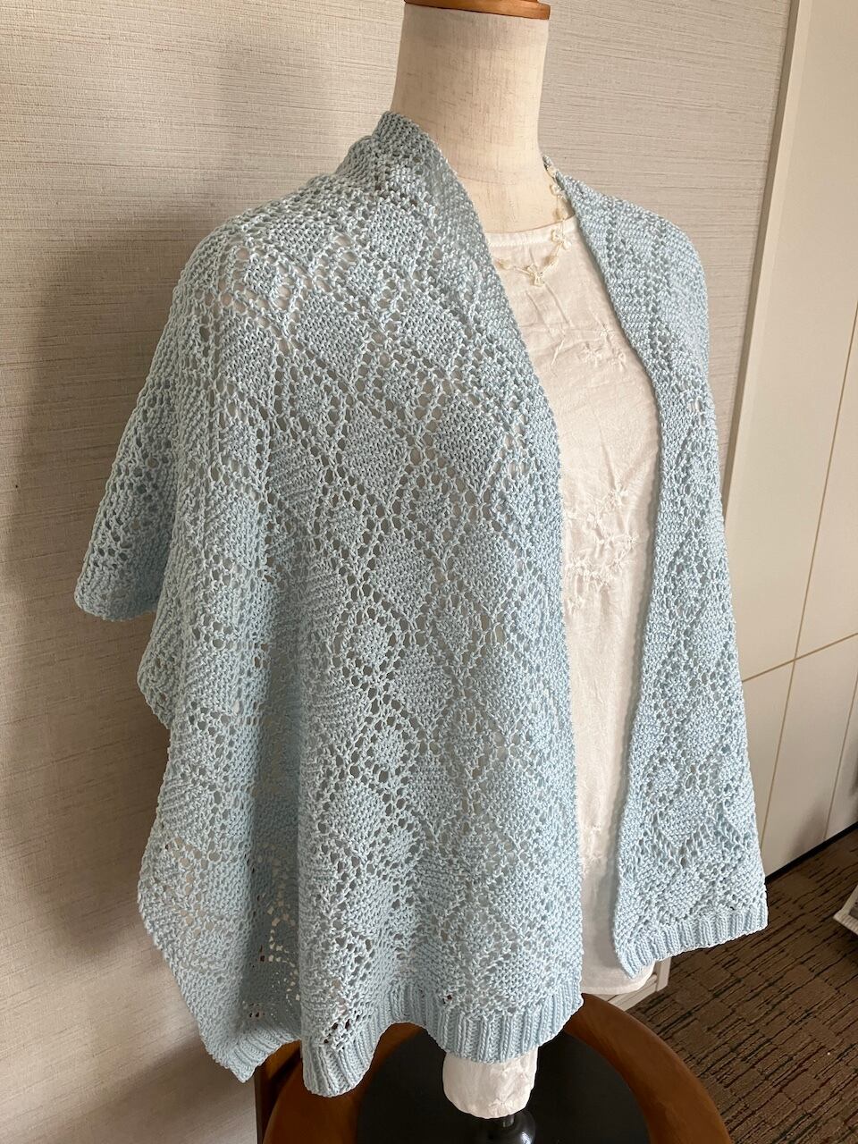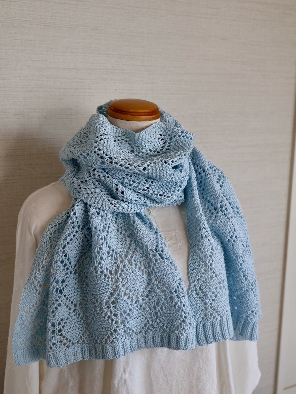 シェットランドレース風に編みましたので、手編みならではの、編み目模様の美しさを楽しんでいただけるストールに仕上がっております。