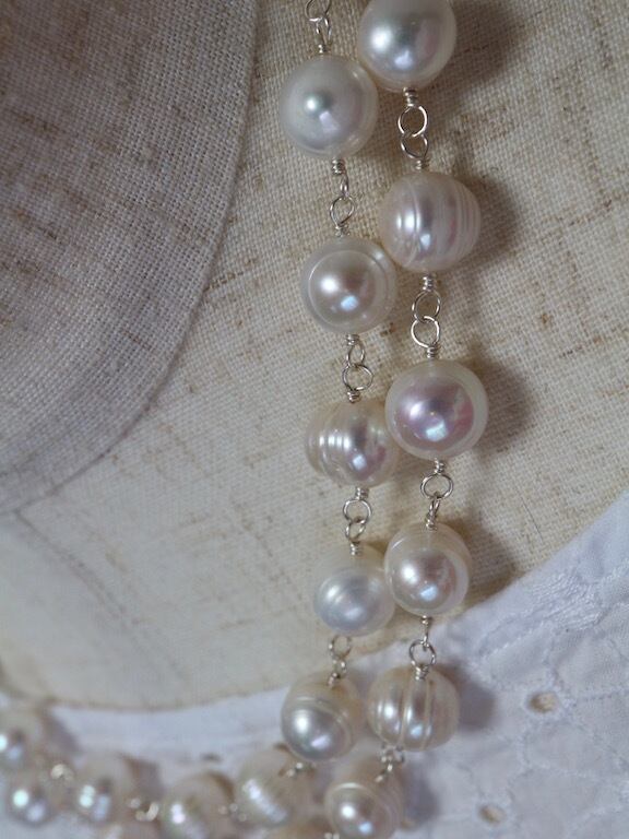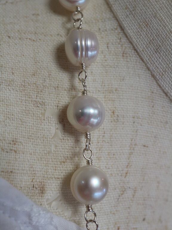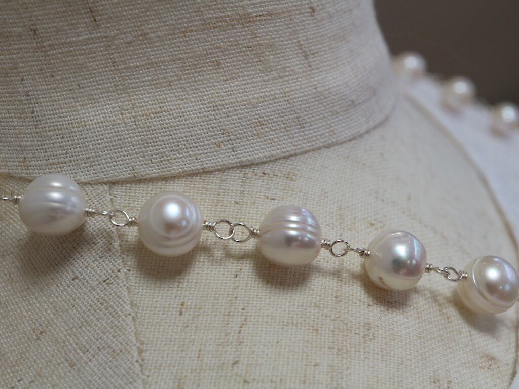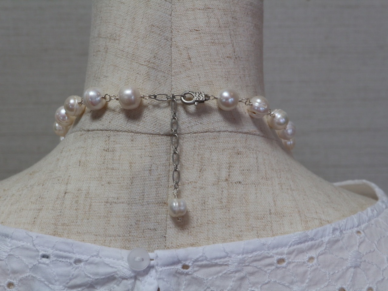 シマシマ模様の入り方が粒ごとに異なり、また形もポテト形の淡水パールらしく表情豊かです。胸元から顔にかけてぱっと明るく華やかにしてくれる、照り艶のすばらしい白い淡水パールです。味わい深く、個性的に仕上がっており、いろいろなシーンで活躍してくれそうなネックレスです。