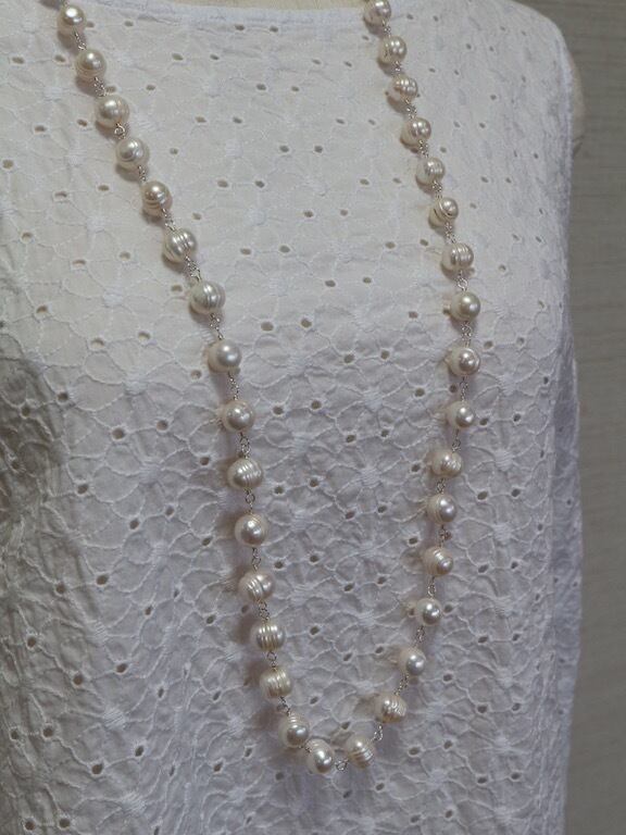 縞の模様が入ったポテト形の淡水パールをワイヤーでつないで作った、ロングネックレスです。全長約89センチですが、5センチのアジャスターがついておりますので、89センチから94センチの間で使用していただくことが可能です。