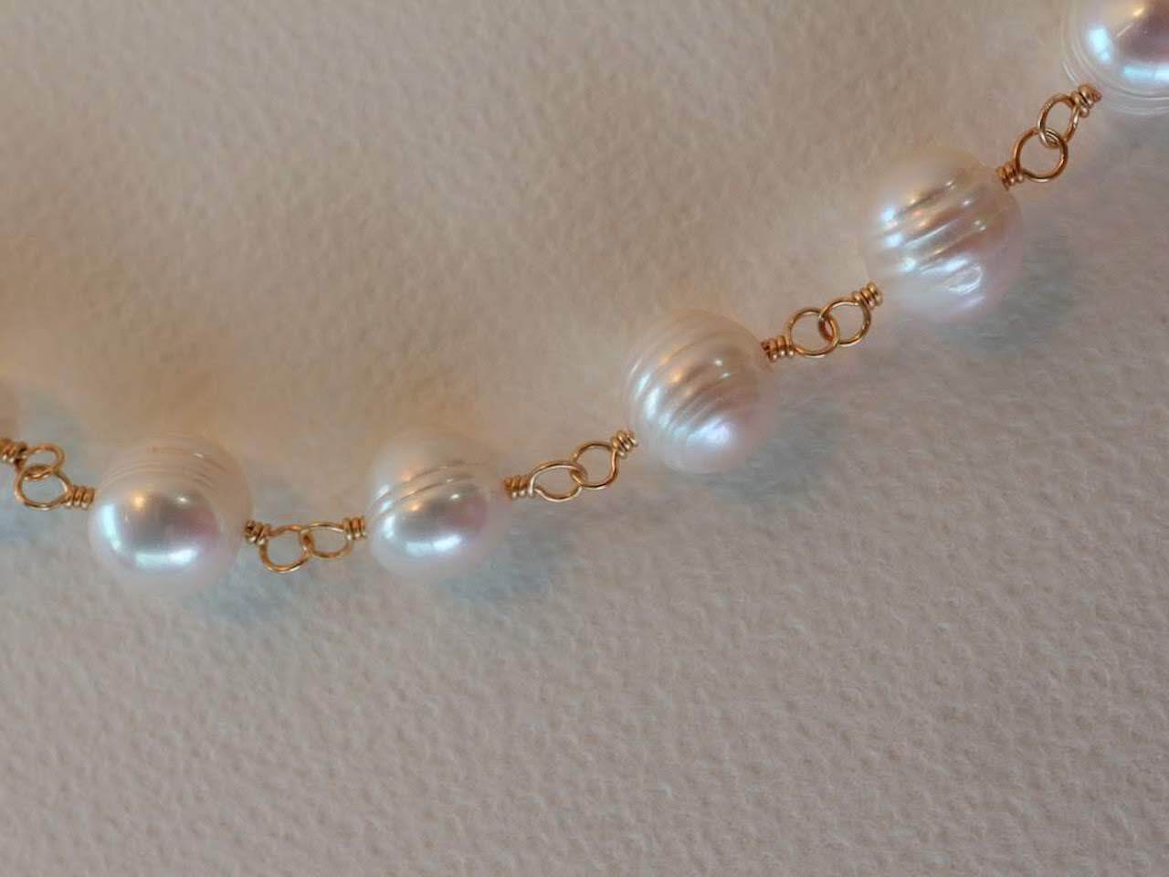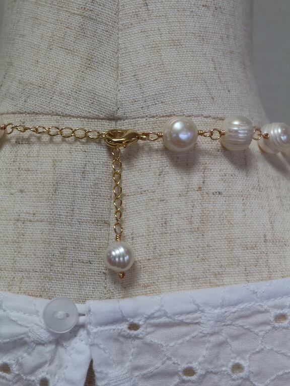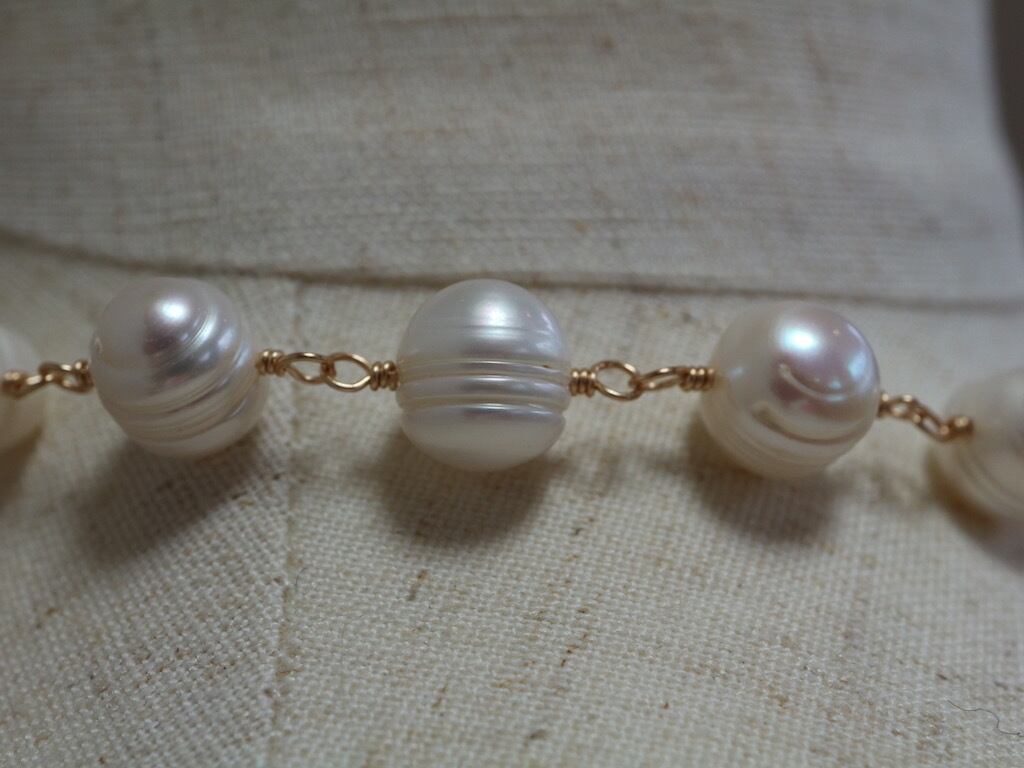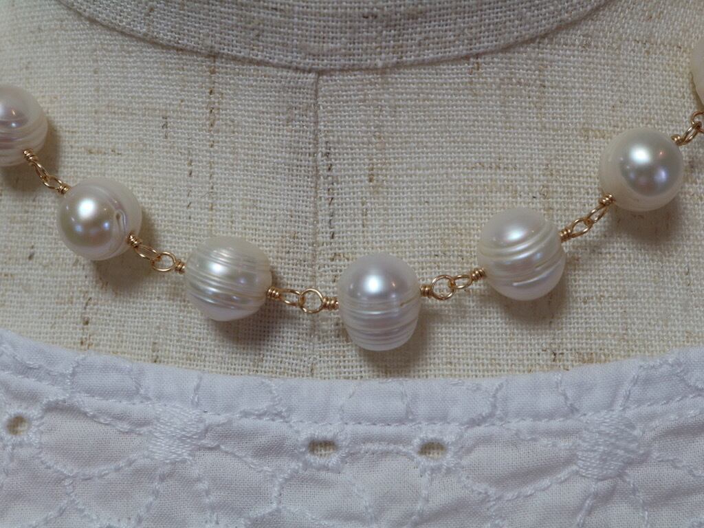縞の模様が入ったポテト形の淡水パールをワイヤーでつないで作った、ショートネックレスです。全長約40センチですが、5センチのアジャスターがついておりますので、40センチから45センチの間で使用していただくことが可能です。