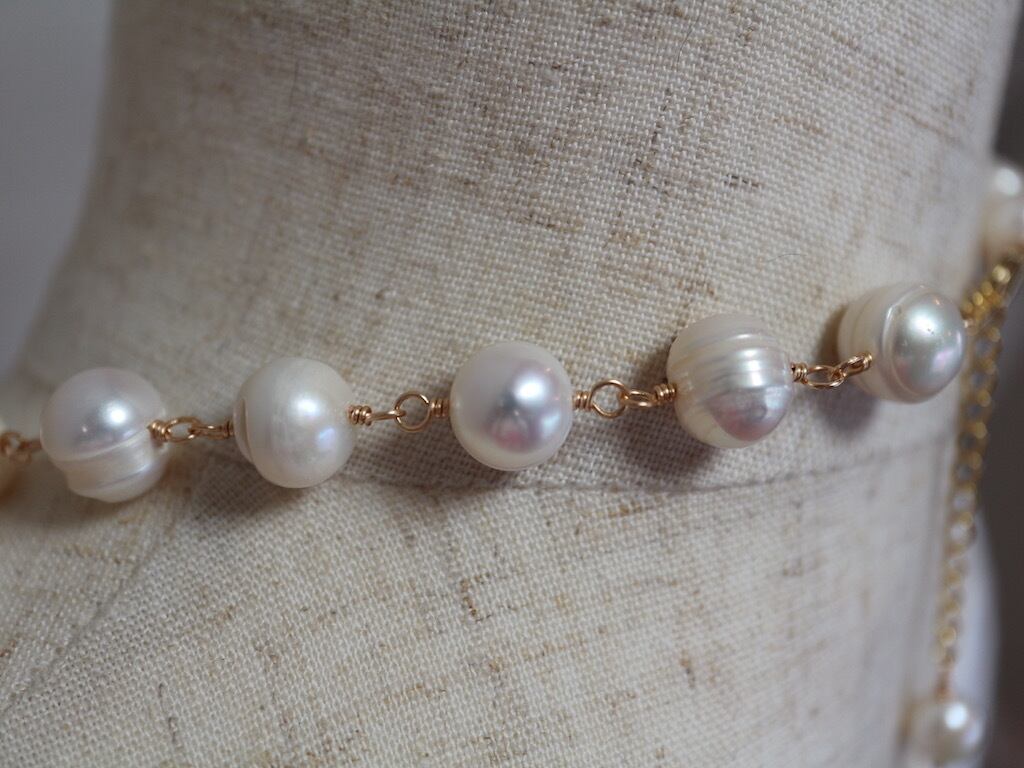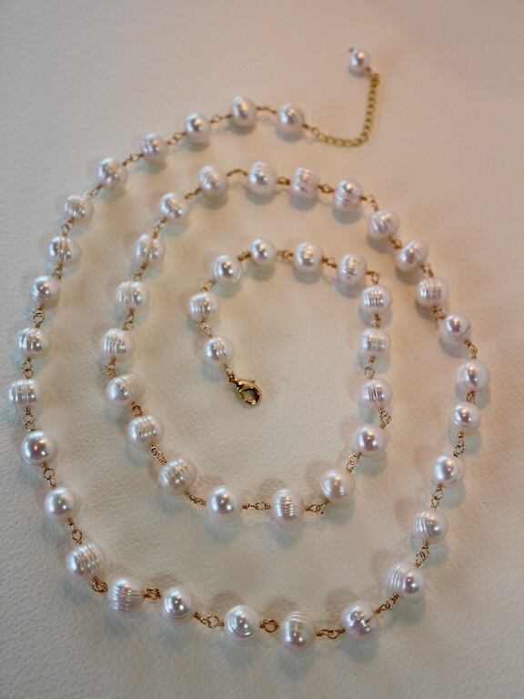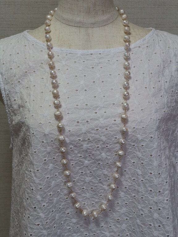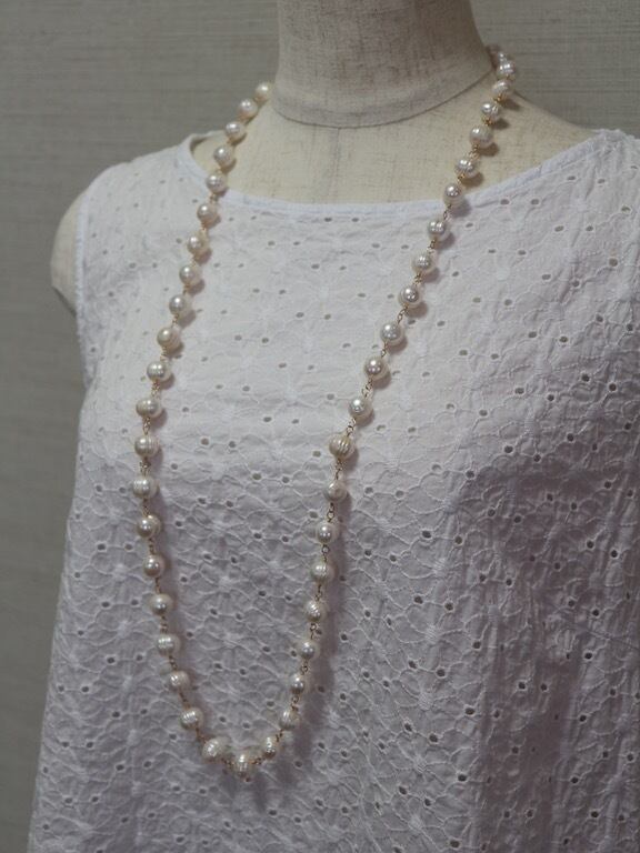 縞の模様が入ったポテト形の淡水パールをワイヤーでつないで作った、ロングネックレスです。全長約89センチですが、5センチのアジャスターがついておりますので、89センチから94センチの間で使用していただくことが可能です。