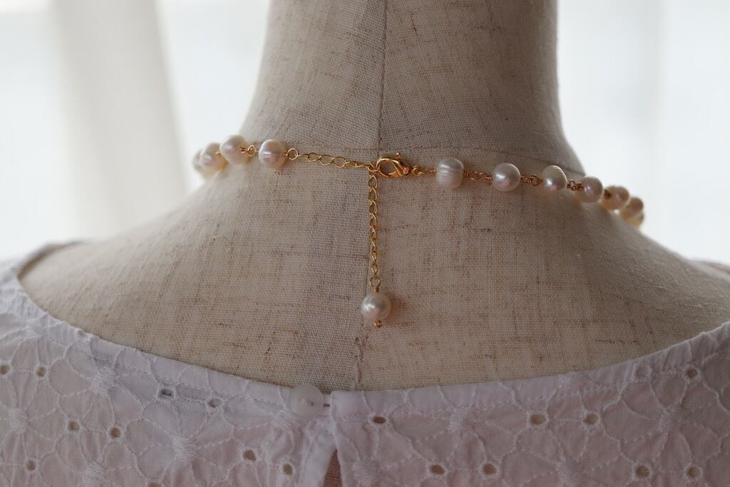 縞の模様が入ったポテト形の淡水パールをワイヤーでつないで作った、ショートネックレスです。全長約40.5センチですが、5センチのアジャスターがついておりますので、40.5センチから45センチの間で使用していただくことが可能です。