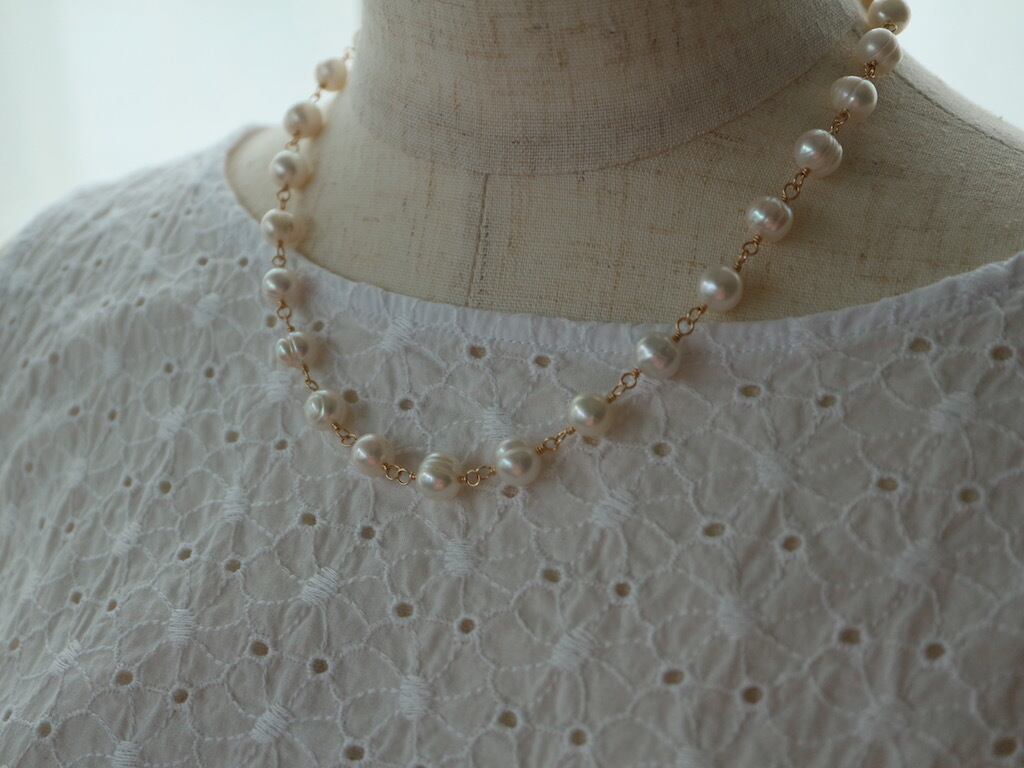 シマシマ模様の入り方が粒ごとに異なり、また形もポテト形の淡水パールらしく表情豊かです。胸元から顔にかけてぱっと明るく華やかにしてくれる、照り艶のすばらしい白い淡水パールです。味わい深く、個性的に仕上がっており、いろいろなシーンで活躍してくれそうなネックレスです。