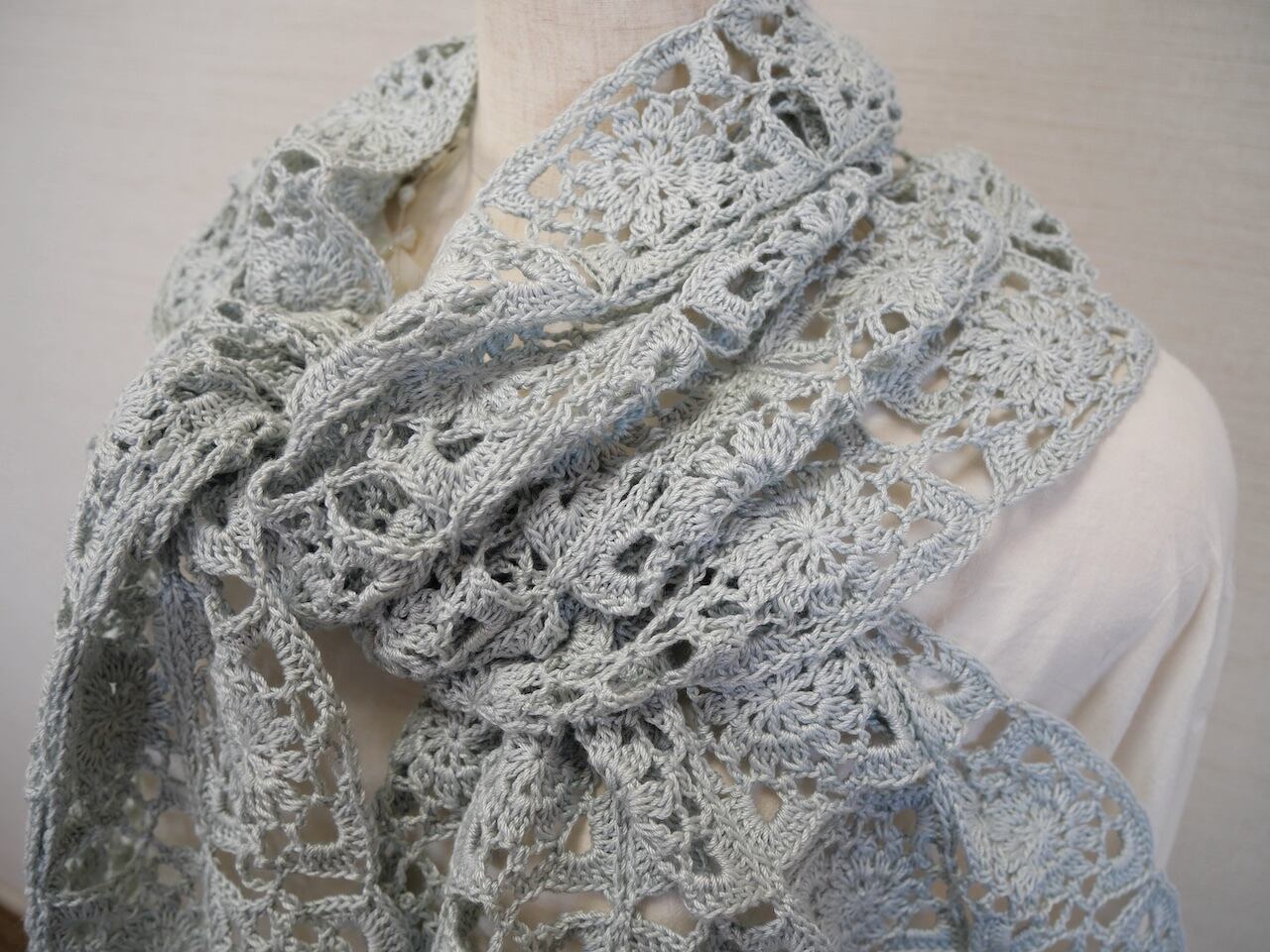 四角いモチーフをつなぎながら編んだ、コットンショールです。