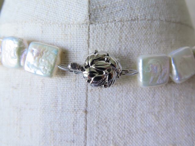 スクエア形の淡水パールで作ったショートネックレスです。使用したパールは、四角い核に真珠層が巻きつくことによってできたもので、とても個性的!。一個のパールの長さは約10.5~11ミリ。ホワイトカラーに虹色のてかりが見られ、真珠ならではのやわらかい色合いのものです。