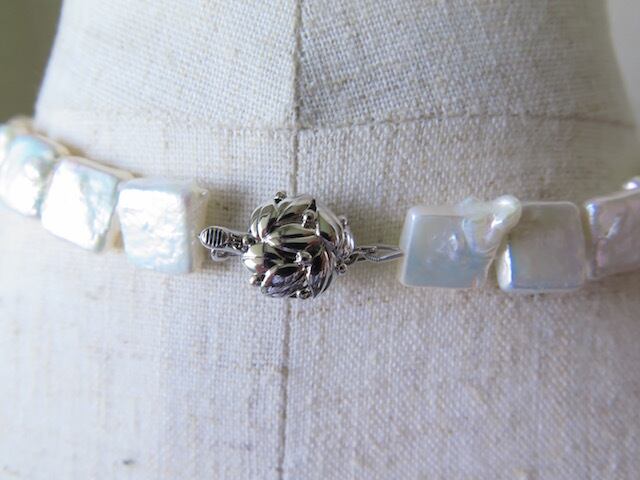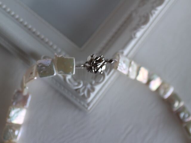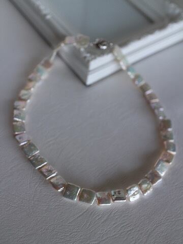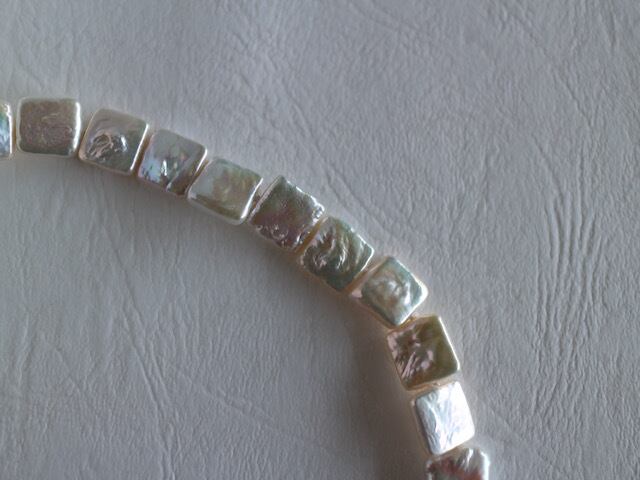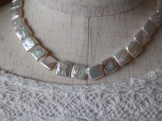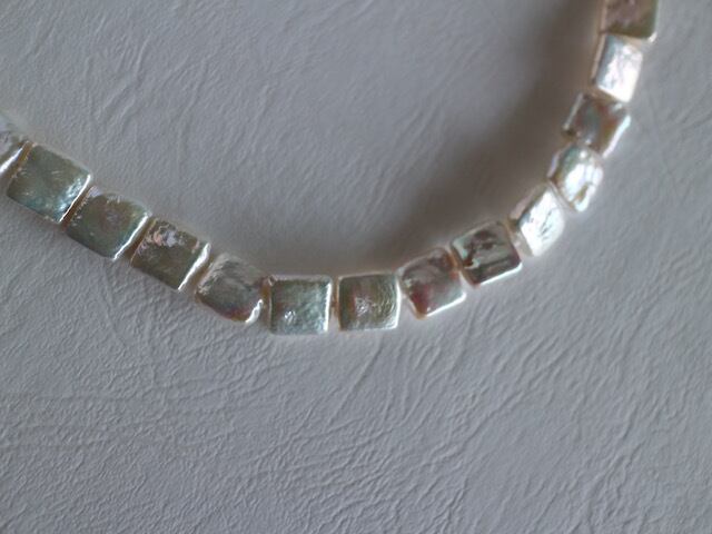 スクエア形の淡水パールで作ったショートネックレスです。使用したパールは、四角い核に真珠層が巻きつくことによってできたもので、とても個性的!。一個のパールの長さは約10.5~11ミリ。ホワイトカラーに虹色のてかりが見られ、真珠ならではのやわらかい色合いのものです。