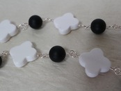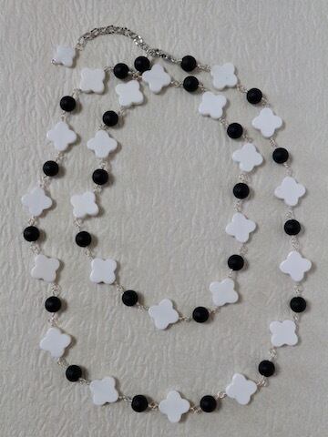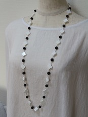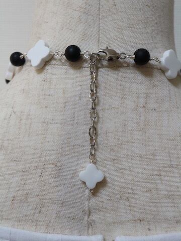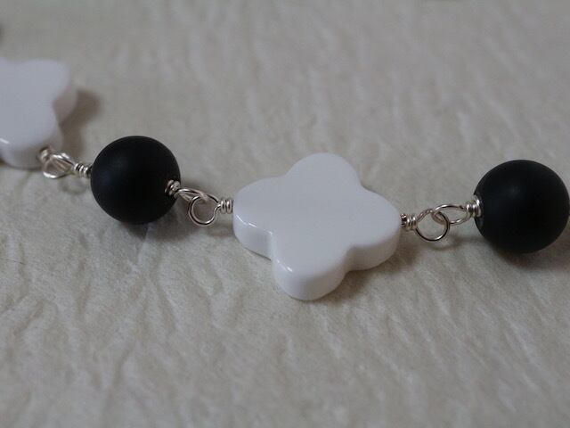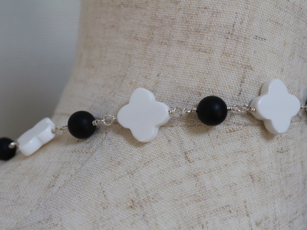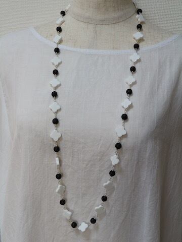 花形ホワイトオニキスと丸形ブラックオニキスを交互にワイヤーでつないで作ったロングネックレスです(技法:メガネ留め)。ホワイトオニキスは天然の純白色、ブラックオニキスはつや消し(フロスト)加工されたもので、どちらも高品質のものです。