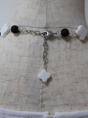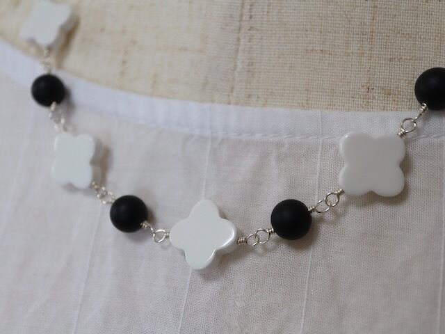 花形ホワイトオニキスと丸形ブラックオニキスを交互にワイヤーでつないで作ったショートネックレスです(技法:メガネ留め)。ホワイトオニキスは天然の純白色、ブラックオニキスはつや消し(フロスト)加工されたもので、どちらも高品質のものです。