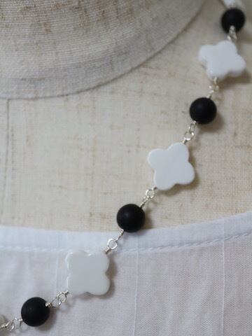 花形と丸形という『形のコントラスト』と、白と黒の『色のコントラスト』を楽しんでいただけるネックレスに仕上がっております。