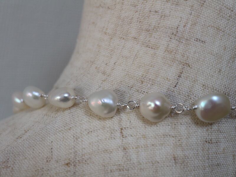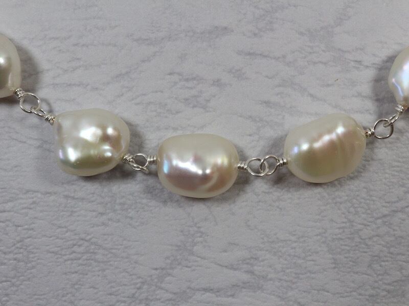 ナチュラルな形のケシパールをワイヤーでつないで作ったショートネックレスです。ケシパールのサイズは縦10ミリから12ミリくらい、横10ミリくらいで、ふっくらとした質感と厚みがあります。粒によって形もさまざまで、天然の真珠ならではの形のバリエーションを楽しんでいただける高品質のものです。