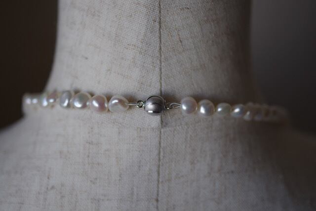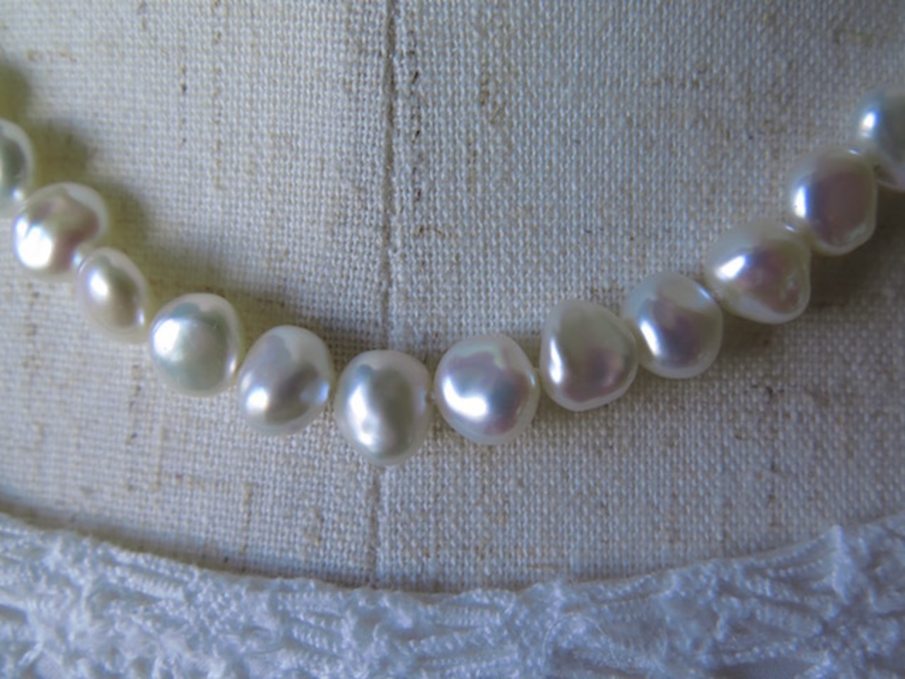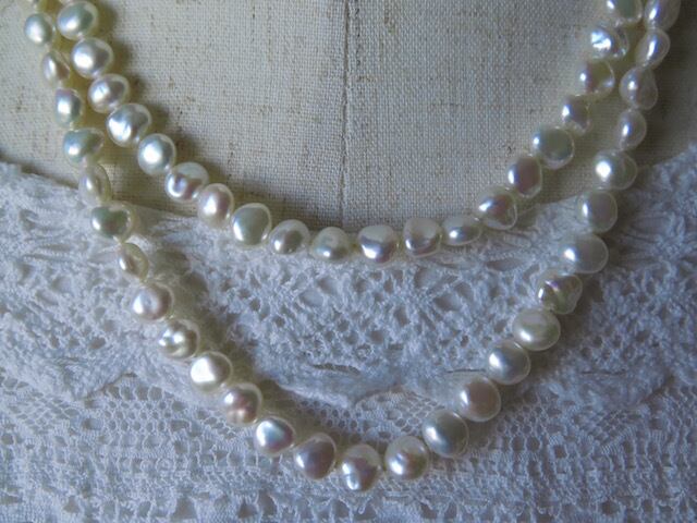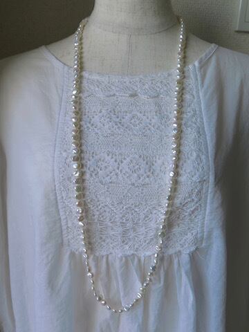 艶やかかな白い淡水パール ケシ形で作ったロングネックレスです。使用したケシパールは7ミリ~8ミリ程度のもので、角度によってうっすらとパール特有の虹色も見えてきます。ケシ形ですので一つ一つ形が個性的で、天然の真珠ならではのクオリティを楽しんでいただけるネックレスです。