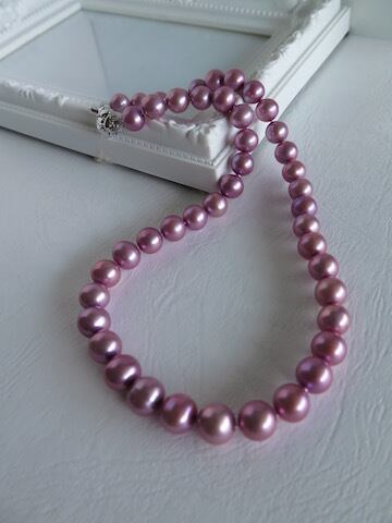 ラウンド~セミラウンド形の淡水パールで作ったショートネックレスです。使用したパールの大きさは9.5~10ミリで、色は「オールドライラック」(染)です。存在感のあるネックレスで、顔を華やかにみせてくれそうな感じがします。