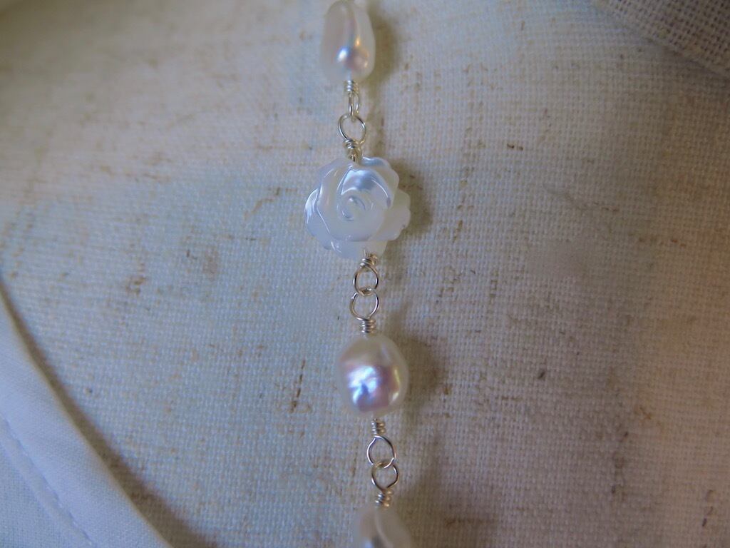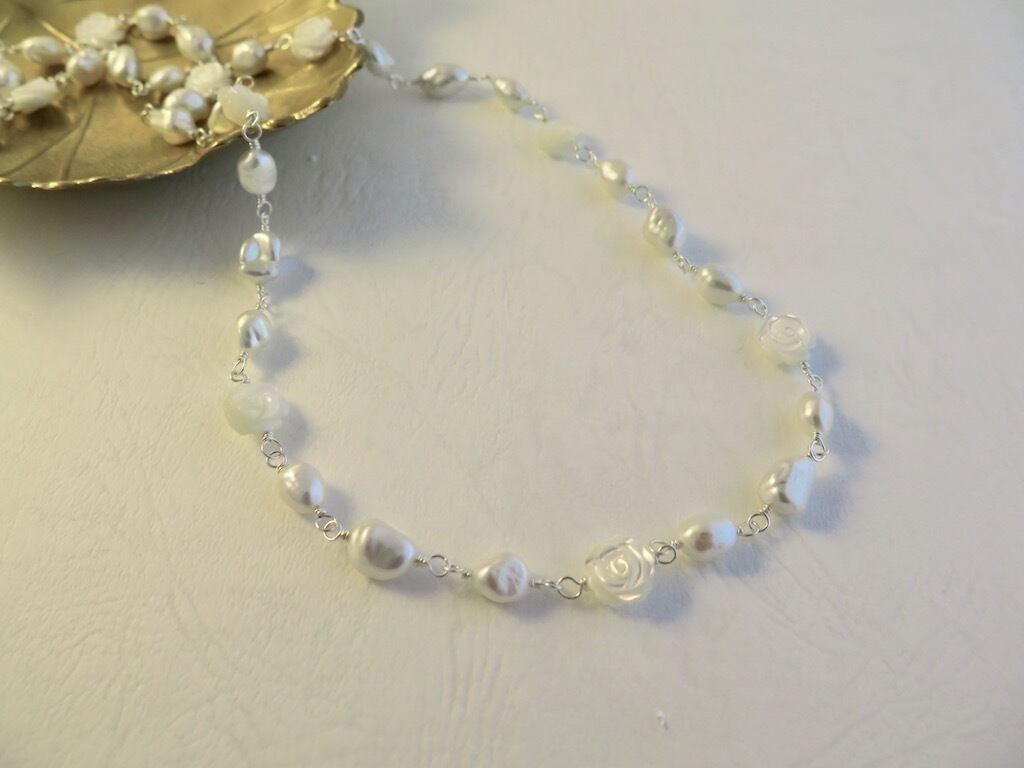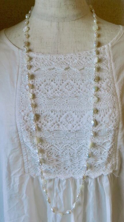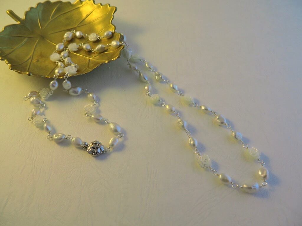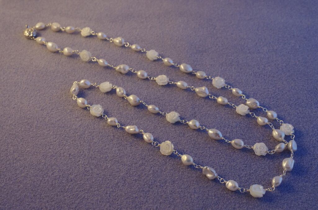 照り・つやの美しい淡水パールとバラ形白蝶貝でロングネックレスを作りました。白蝶貝は両面に丁寧にカッティング加工が施されているものです。