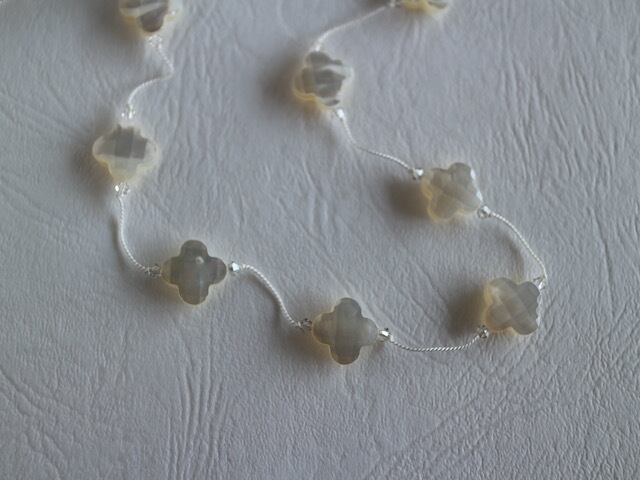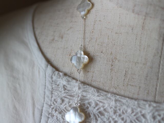 高品質のホワイトシェル(白蝶貝)で作ったロングネックレスです。シェル1個を2個のスワロフスキーではさんで、絹100%のビーズ用糸(グリフィン糸)で結び目を作りながら作りました。白蝶貝は13ミリ、スワロフスキーは3ミリ。