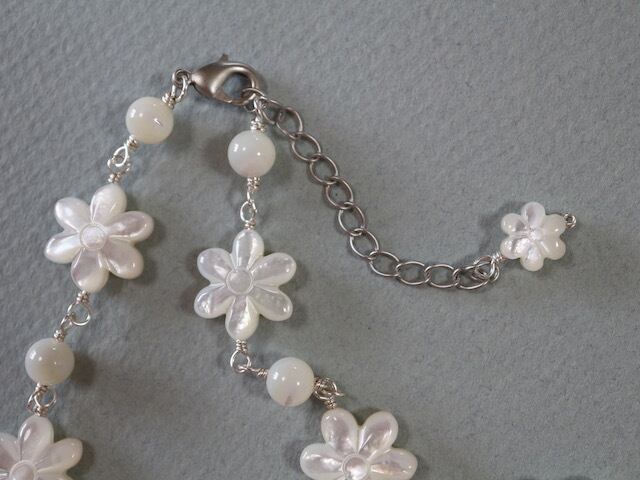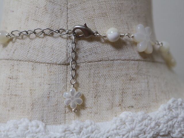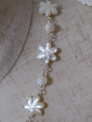 15ミリの6枚花形と6ミリ丸形の白蝶貝を交互にワイヤーでつなげて作ったネックレスです。6枚花形の白蝶貝は、一つ一つ手作業で彫刻された美しいデザインのものです。数多くは流通していない稀少品で、次回の入荷も全く未定となっております。