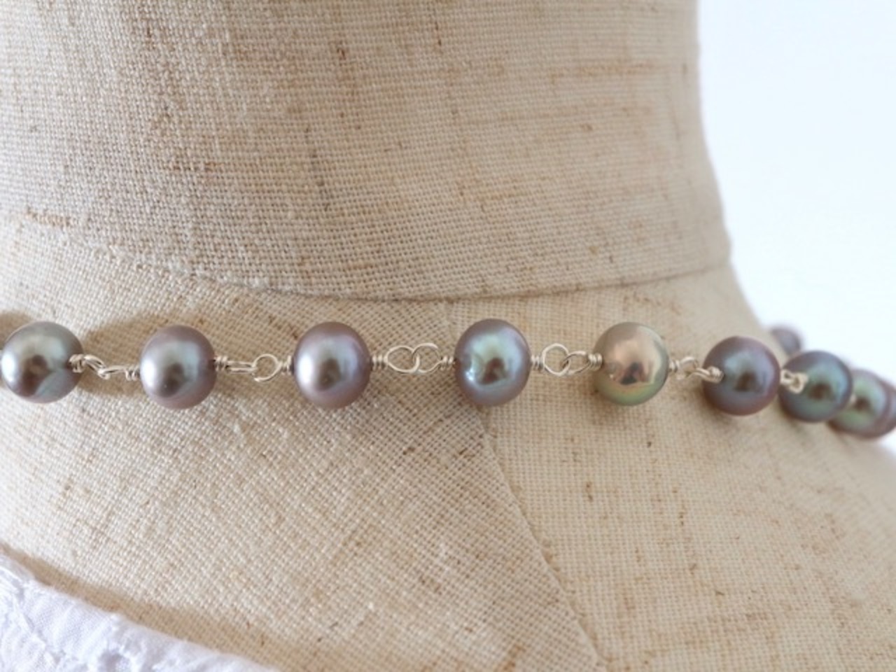 6ミリ-7ミリのポテト形淡水パール(染)をワイヤーでつないだショートネックレスです。使用したパールは淡いグレイ系の色ににしっかりと染色されたもので、パール本来の照りツヤがでており、その美しさを堪能していただけます。