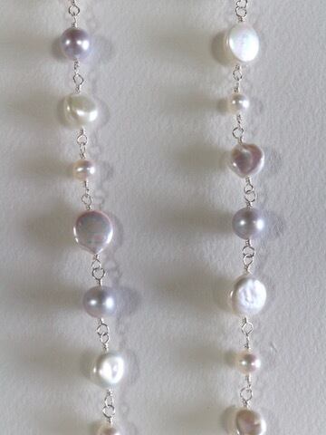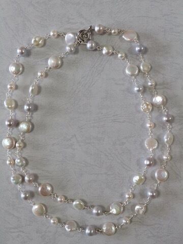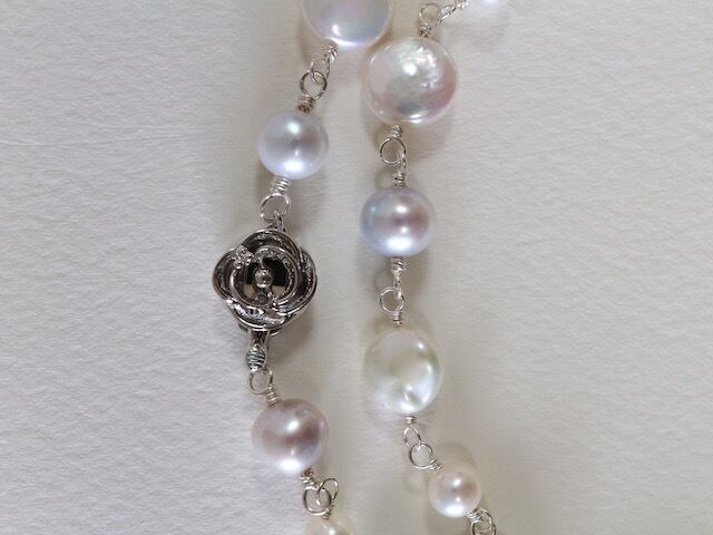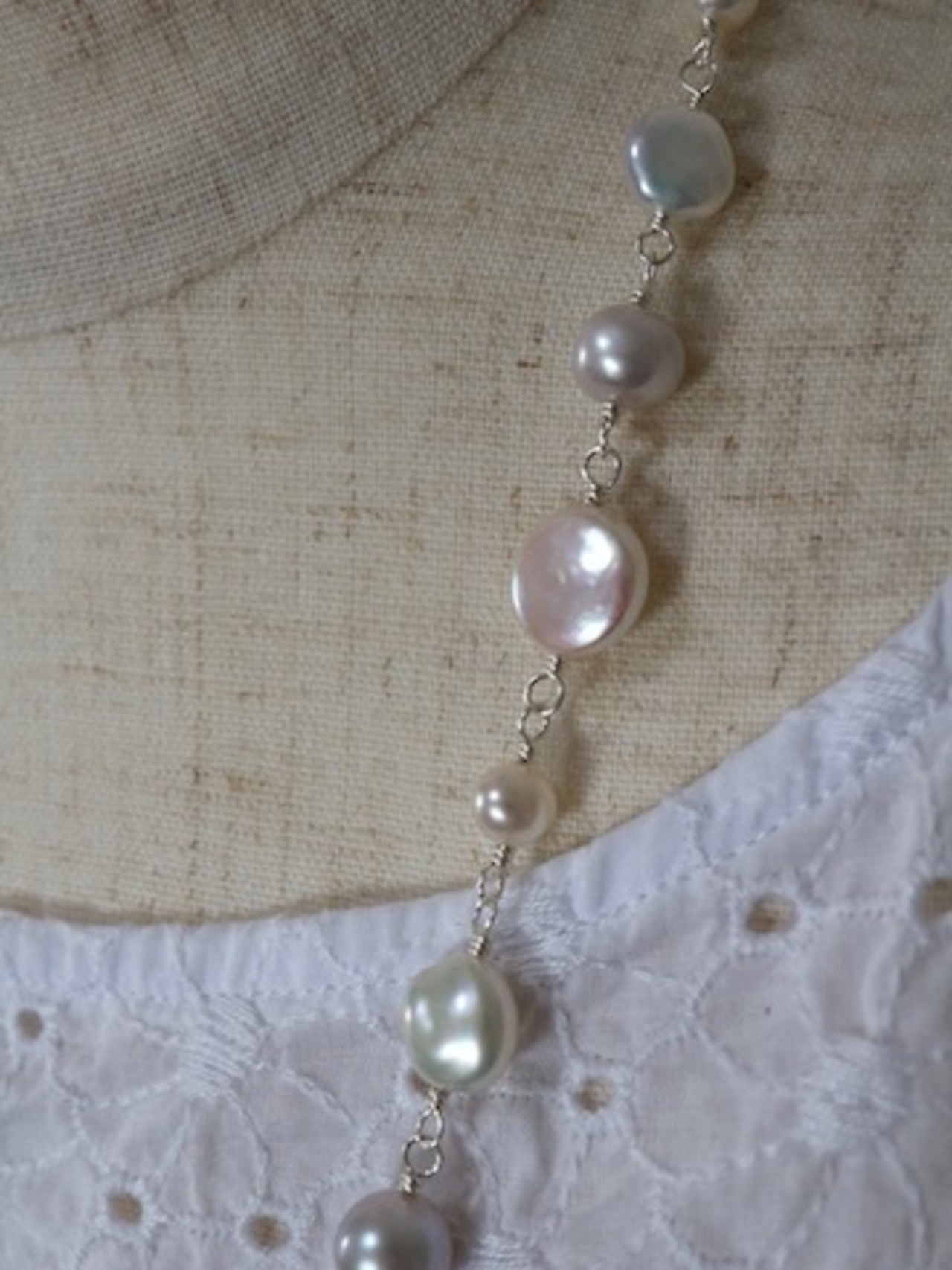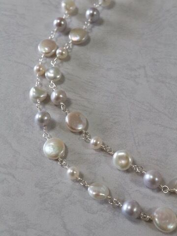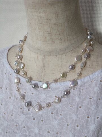 ホワイトやライトグレーの4種類の淡水パールを、1→2→3→4→1→2→3→4...と、繰り返しワイヤーでつないだロングネックレスです。