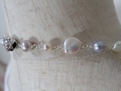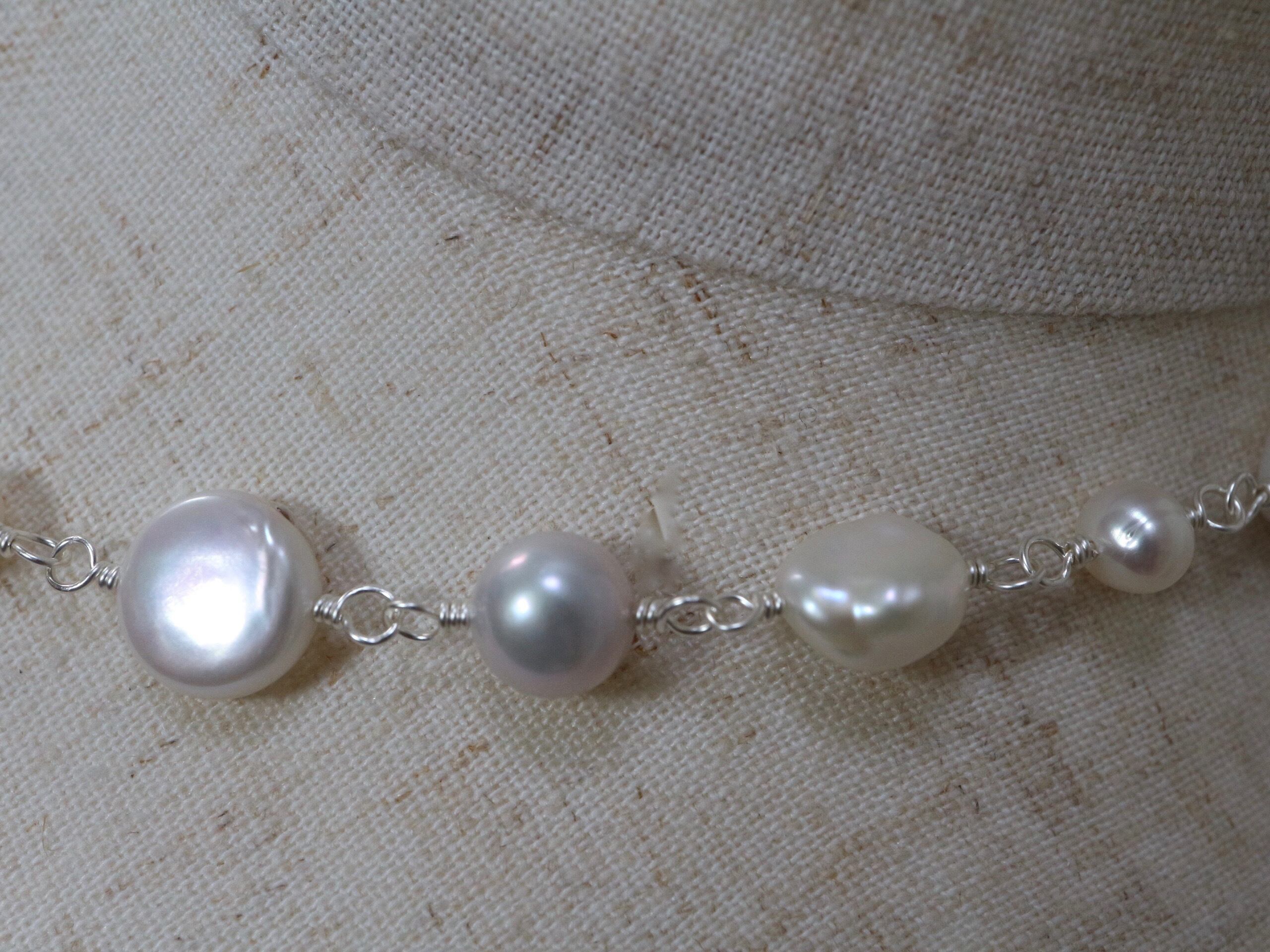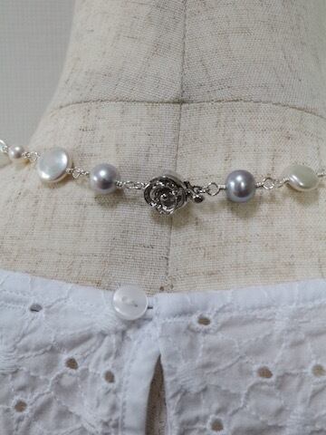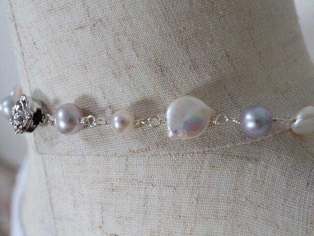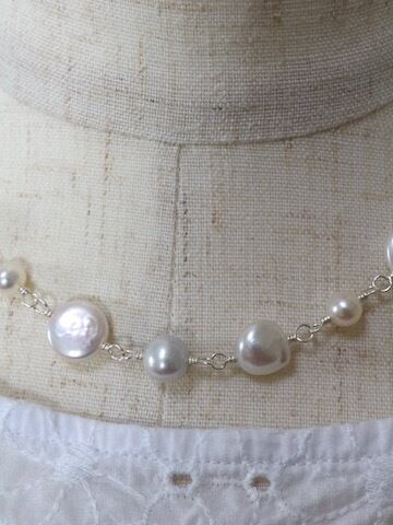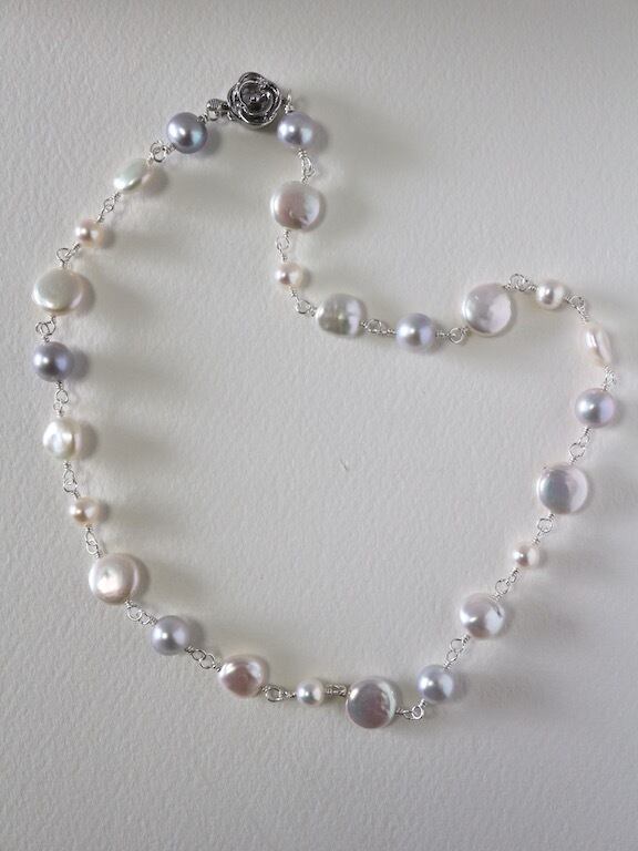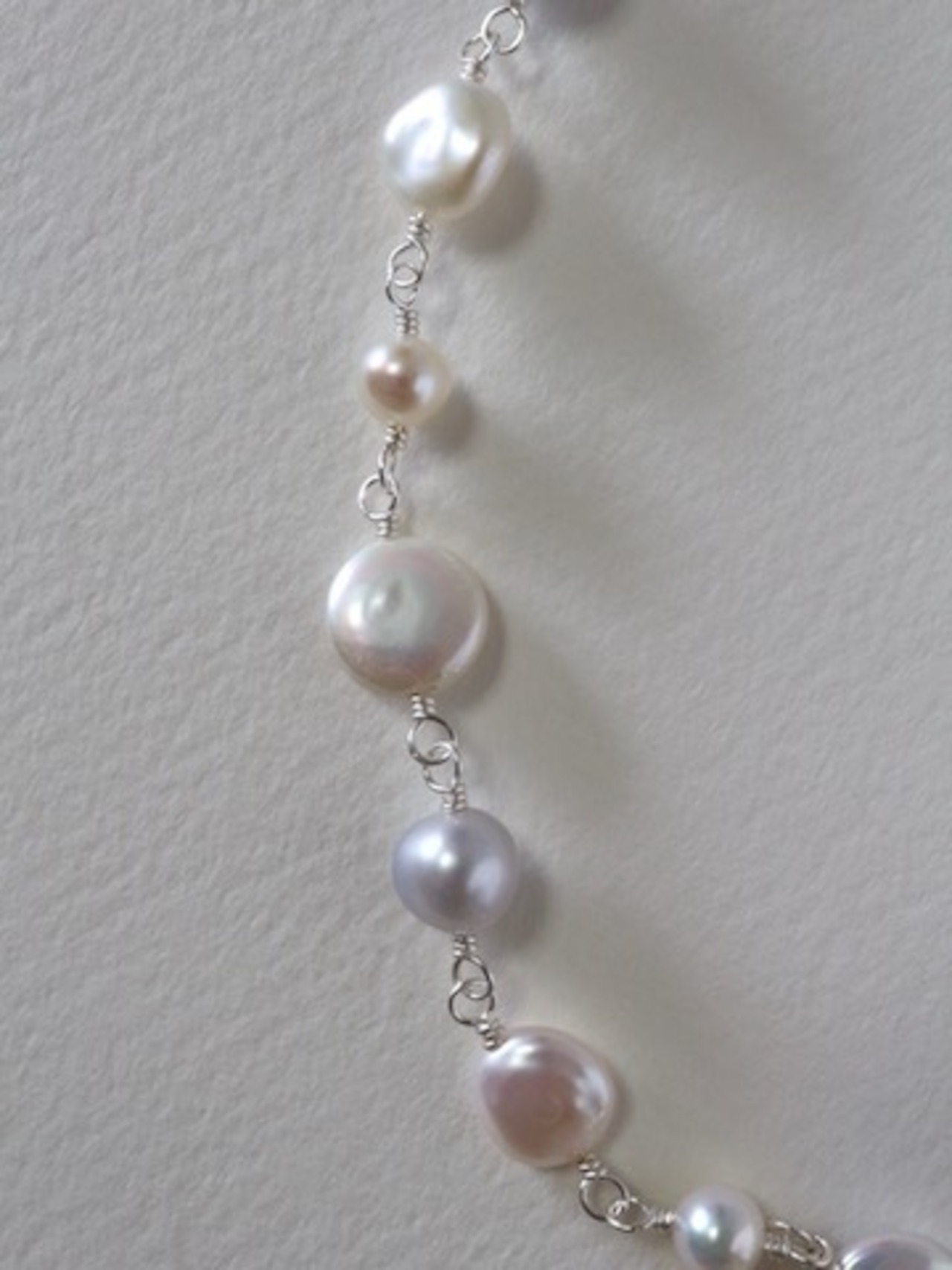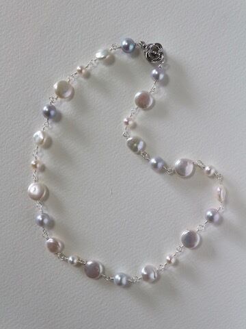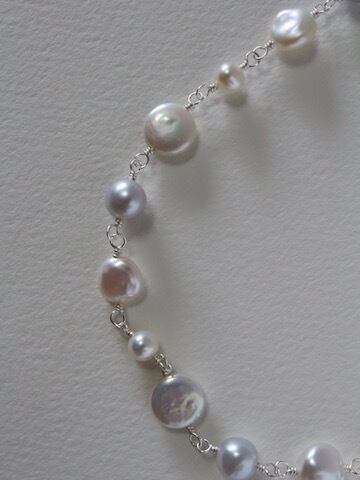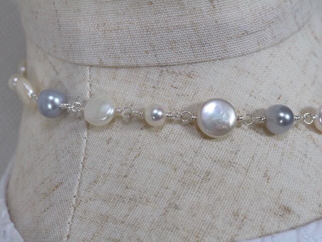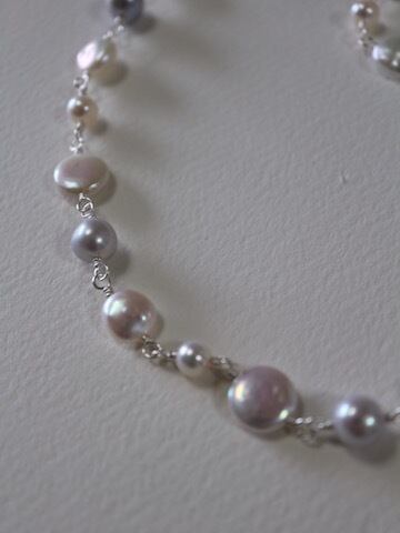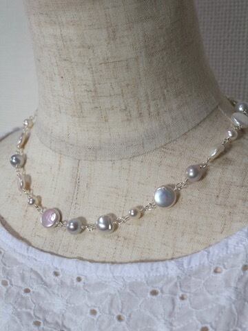 ホワイトやライトグレーの4種類の淡水パールを、1→2→3→4→1→2→3→4...と、繰り返しワイヤーでつないだショートネックレスです。