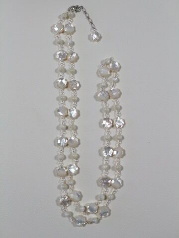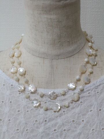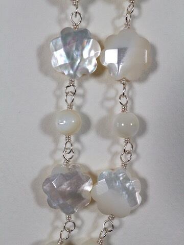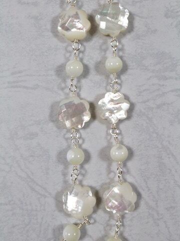 12ミリの花形と6ミリの丸形のシェル(白蝶貝)を交互にワイヤーでつないで作ったネックレスです。花形のシェルは表面カッティンが施された高品質のものです。全長約90センチですが、5センチのアジャスターで90センチー95センチでお着けいただくことができます。アジャスター先端には、一回り小さい10ミリの花形シェルをつなげております。