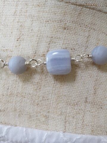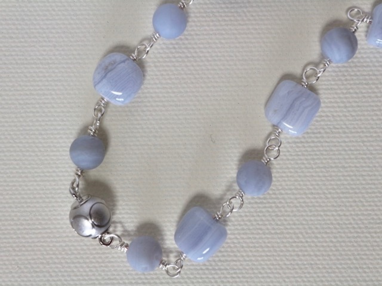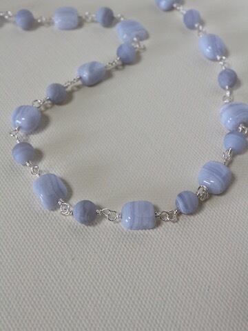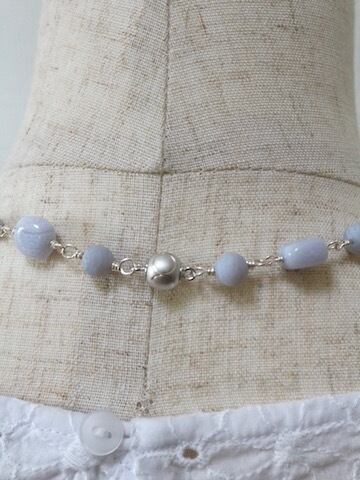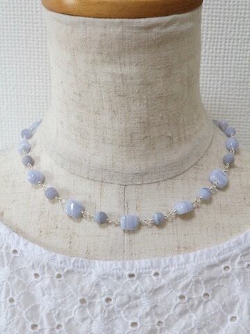 タンブル形とラウンド形(フロスト)のブルーレースをワイヤーでつないだショートネックレスです。