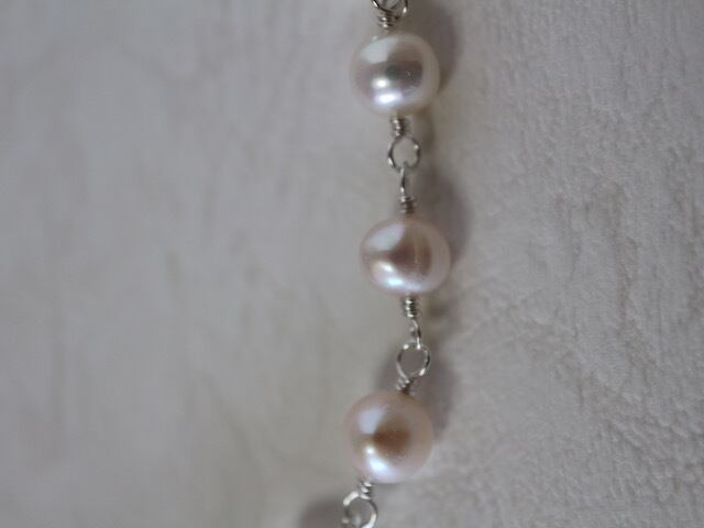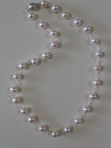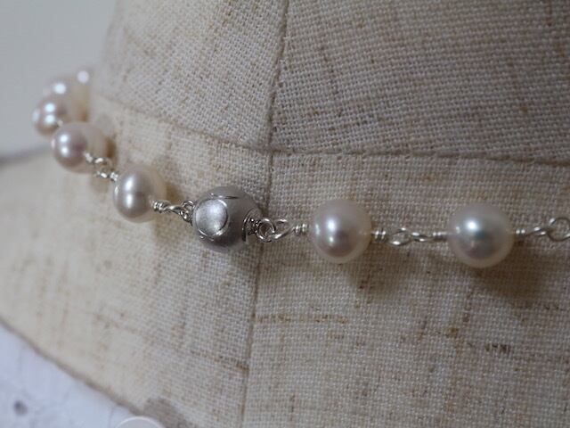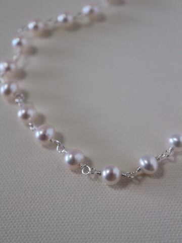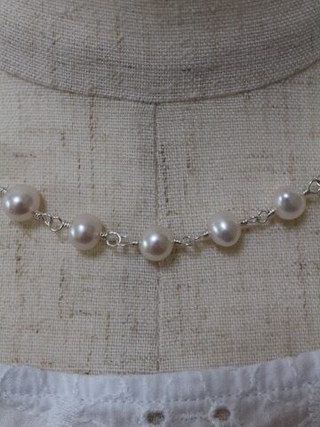 7ミリ-7.5ミリポテト形の白い淡水パールをワイヤーでつないだショートネックレスです。使用したパールはふっくらとしたポテト形の淡水パールで、パール本来の照りツヤなどが素晴らしいものです。