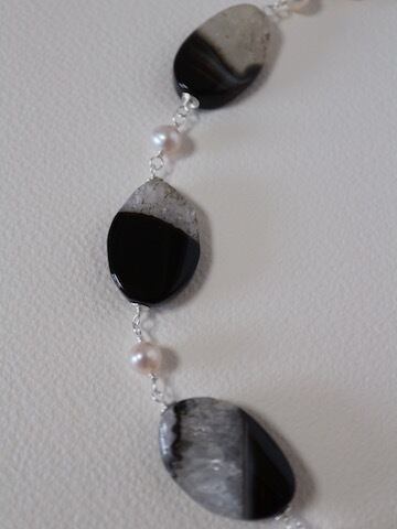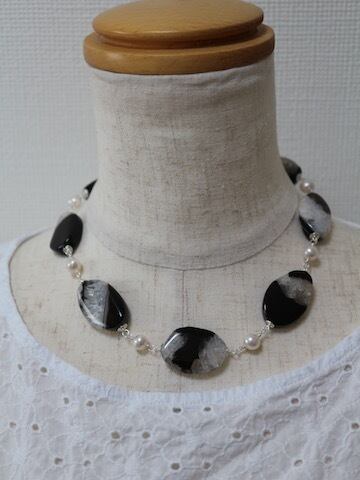 希少品のパンダアゲートと淡水パールをワイヤーでつないで作ったショートネックレスです。全長約40センチ。