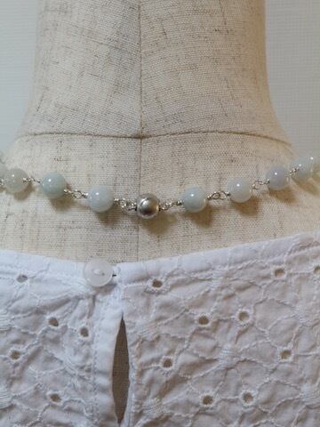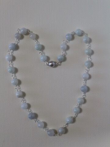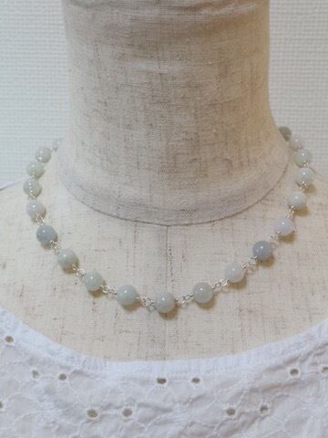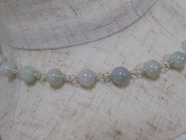 8ミリ丸形の白翡翠(ホワイトジェダイト)をワイヤーでつなげたショートネックレスです。全長約40センチ。留め金具にマグネット式のクラスプを使用しておりますので、着けたり外したりするのが楽です。使用した翡翠は白っぽいもの、クリーム色っぽいもの、淡いグレーっぽいもの、中にレースのような模様が見えるものなど、天然石ならではの自然発生的な色や模様を堪能していただけます。インクルージョン(黒っぽい内容物)もほぼ無く、高品質の翡翠です。