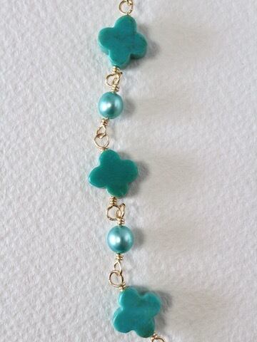 花形ターコイズとターコイズカラーの淡水パール(染)をワイヤーでつないで作ったショートネックレスです。