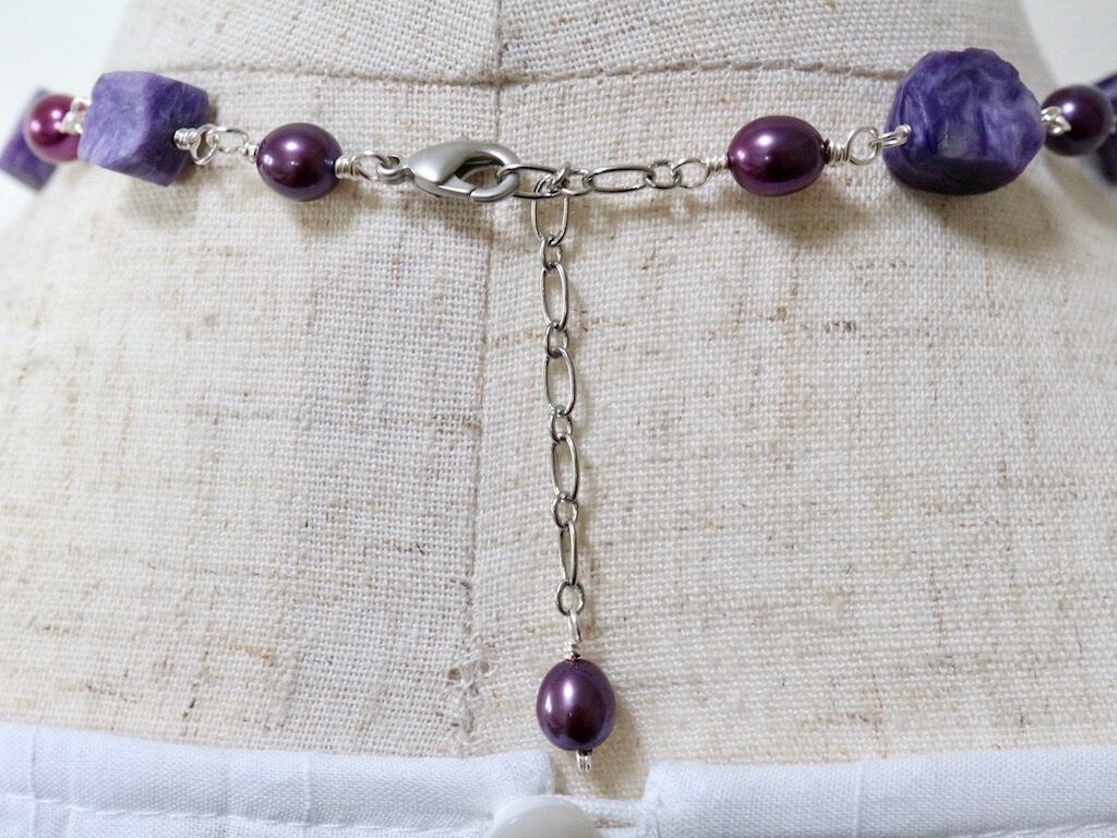 ラフロック タンブル 形のチャロアイトとライス形の淡水パールを、ワイヤーで交互につないで作ったショートネックレスです。タンブル形のチャロアイトは、まるで採掘されたままの天然形に近い形状をしており、たいへん珍しいものです。美しいパープル色に原石の模様が見られており、一つ一つ表情豊かです。また、淡水パールは、パープル色にしっかり染色されたものです。パール本来の輝りつやが素晴らしく、高品質のものです。