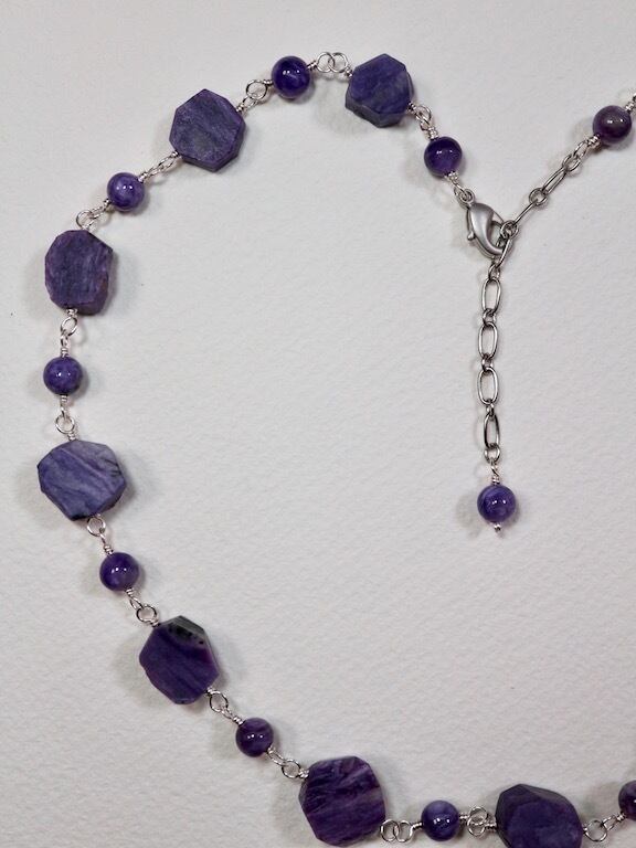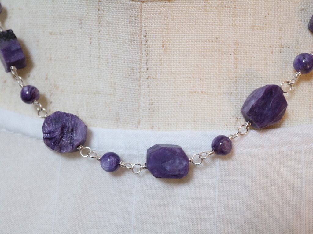 ラフロック タンブル 形と丸形のチャロアイトを、ワイヤーで交互につないで作ったショートネックレスです。タンブル形のチャロアイトは、まるで採掘されたままの天然形に近い形状をしており、たいへん珍しいものです。美しいパープル色に原石の模様が見られており、一つ一つ表情豊かです。
