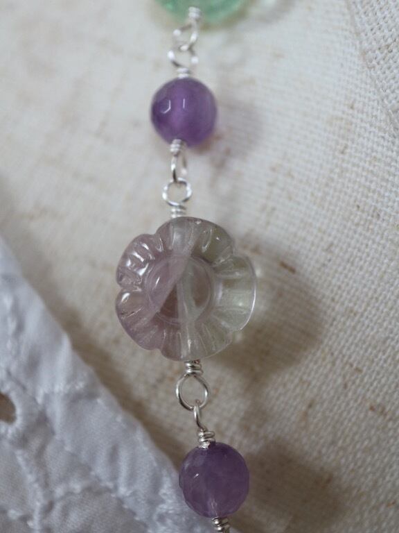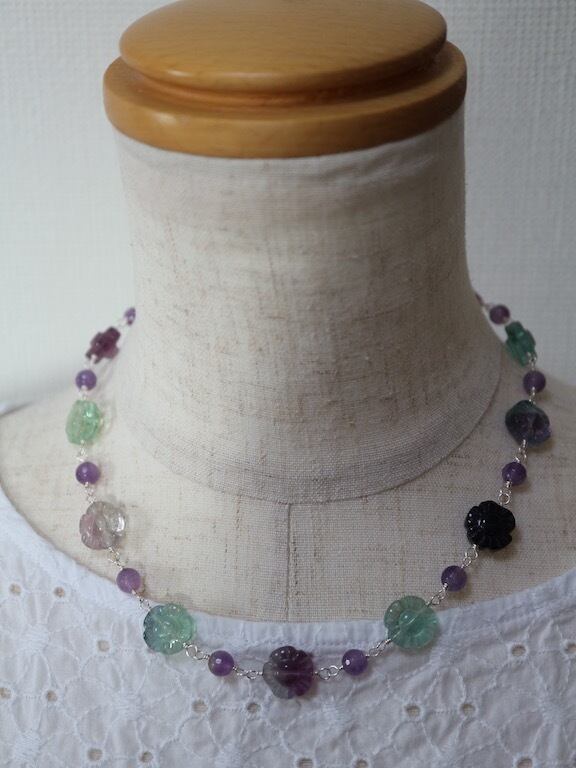 可愛らしいフラワーカッティングのフローライトと丸型アメジストをワイヤーで交互につないで作ったショートネックレスです(メガネ留め)。