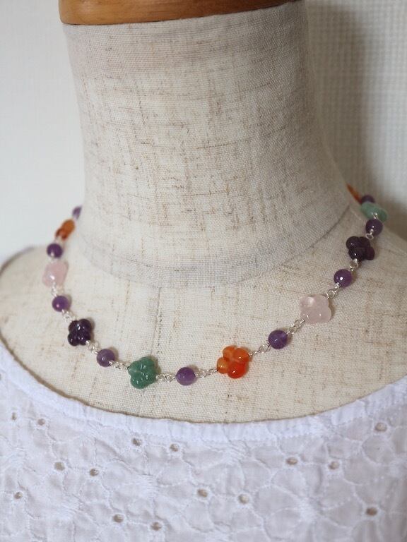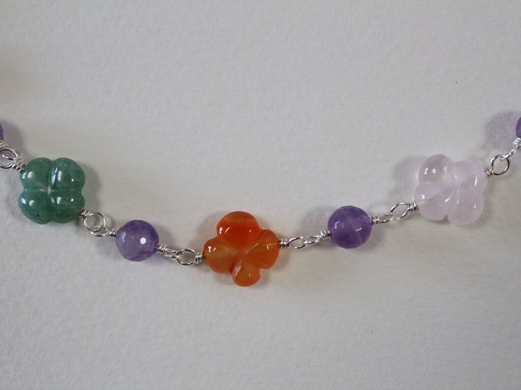 四葉のクローバー形のいろいろな天然石と、表面カッティングの美しいアメジストを交互につないで作ったショートネックレスです。クローバー形天然石は主に、アメジスト、グリーンアベンチュリン、カーネリアン、ローズクオーツなどです。