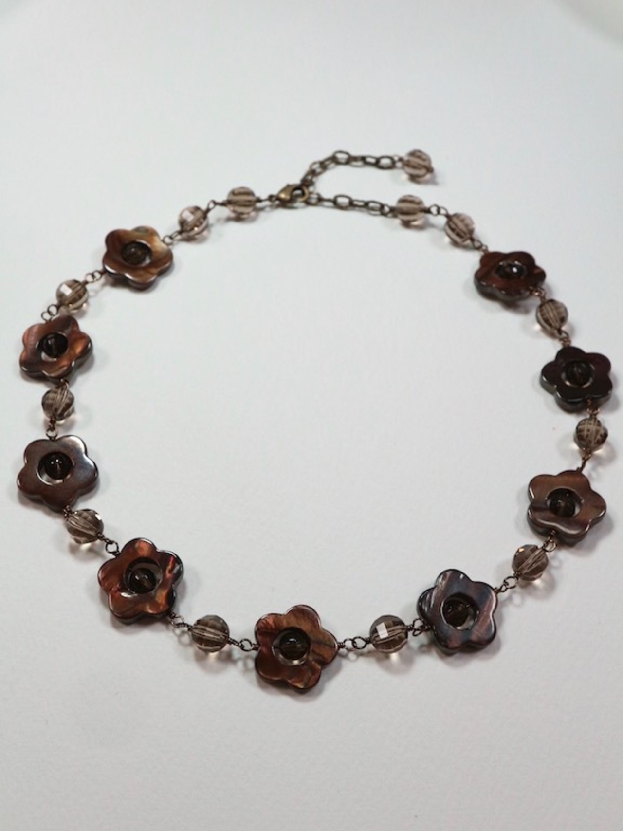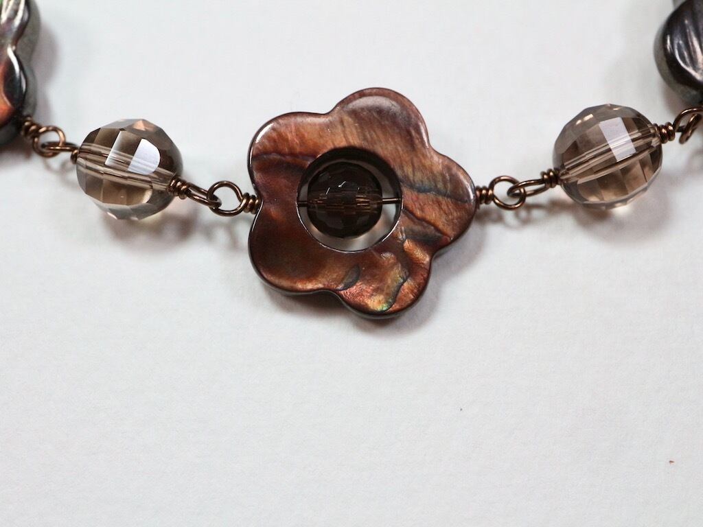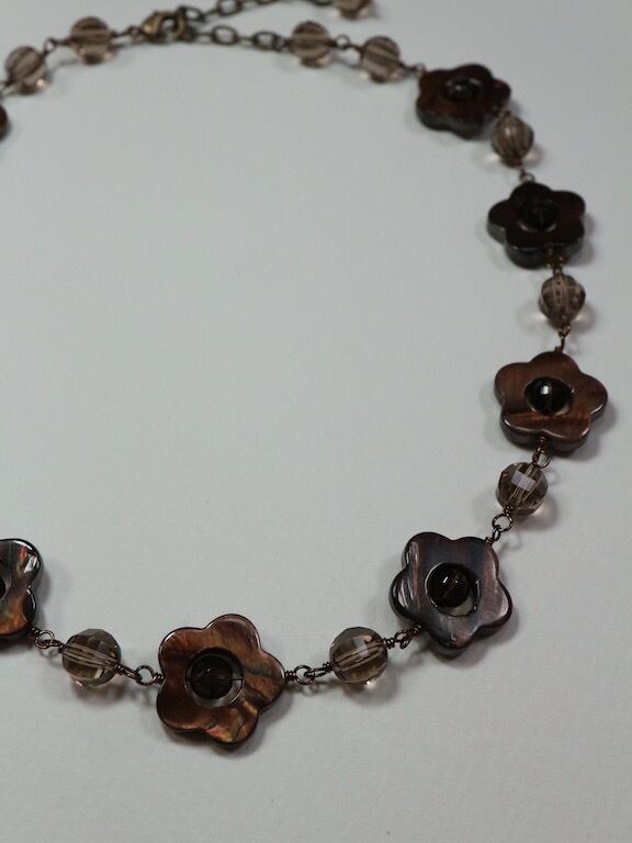 花形のブラウンシェルとスモーキークオーツで作ったショートネックレスです。使用したブラウンシェルは真ん中が丸く開いているデザインのもので、その中に丸いスモーキークオーツを入れました。その花パーツとバルーンカットのスモーキークオーツをワイヤーでつないでいます(めがね留め)。