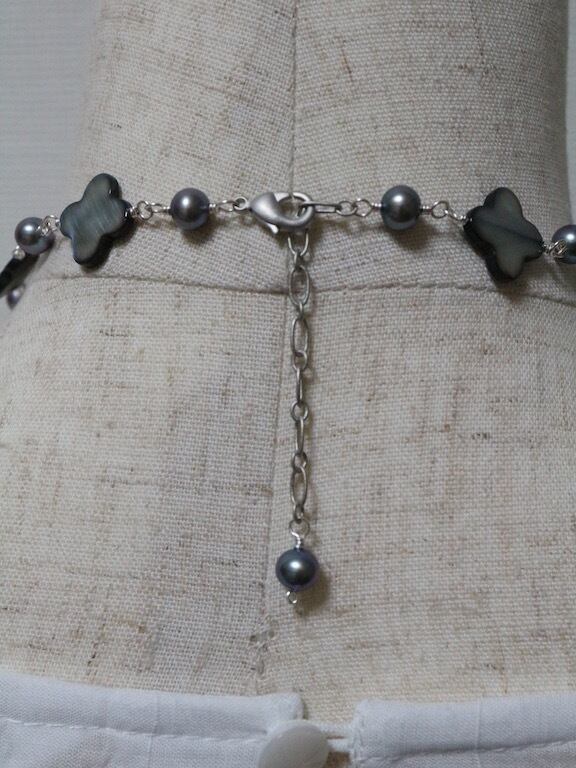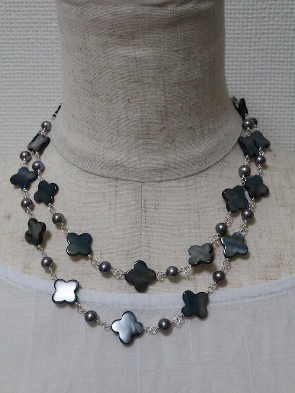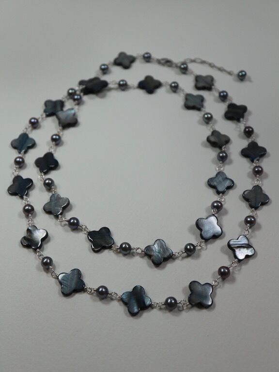 濃紺色の花形シェルと淡水パールを交互にワイヤーでつないで(メガネ留め)作ったロングネックレスです。濃紺色シェルとパールは着色ですが、しっかりと色付け処理されたものです。濃紺色の花形シェルはあまり流通していない希少品です。