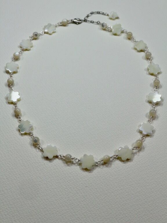 照りの美しいシェル(マザーオブパール)の花形と丸形をワイヤーでつないで作ったショートネックレスです。全長約45センチですが、5センチのアジャスターで50センチまで長くして着けていただくことができます。