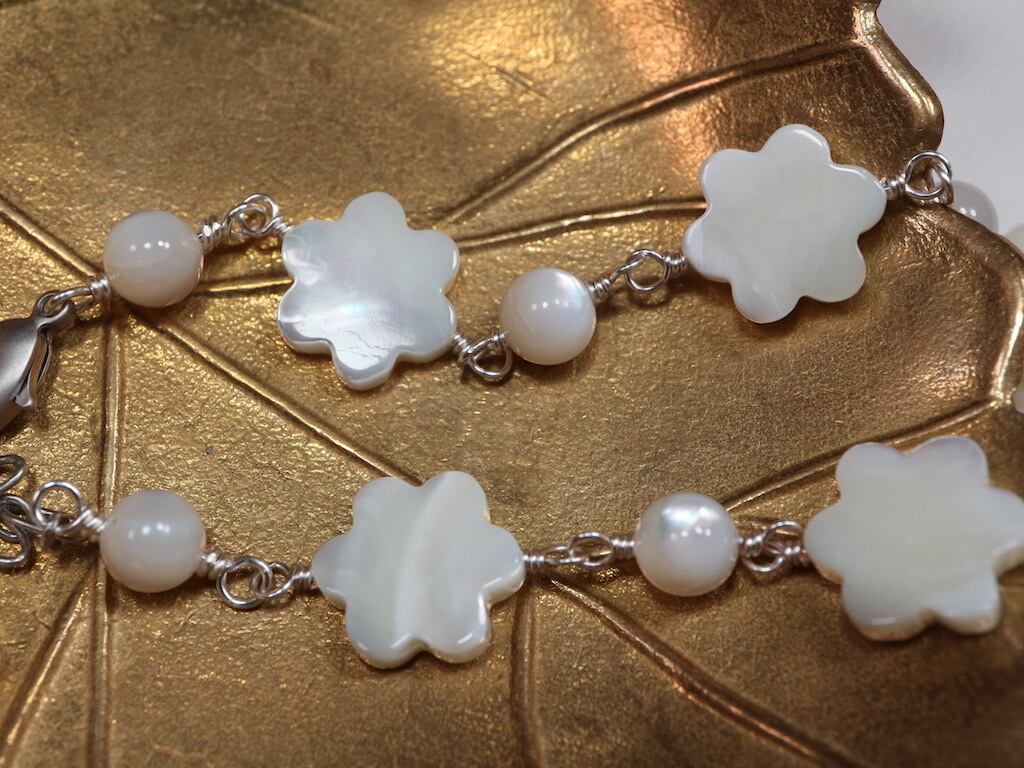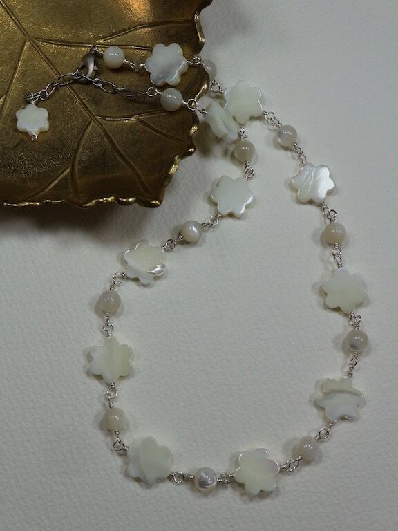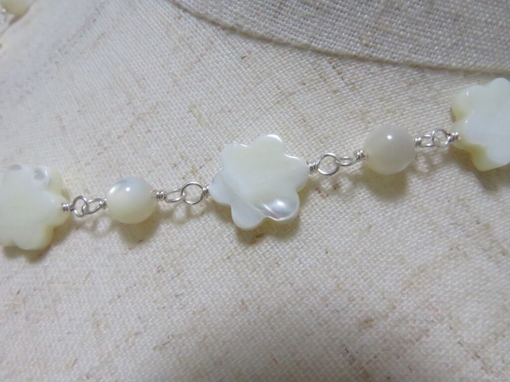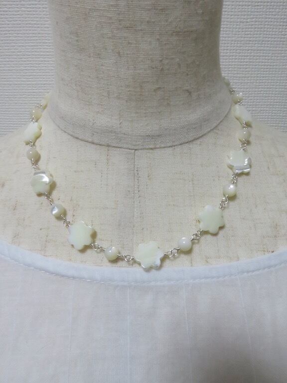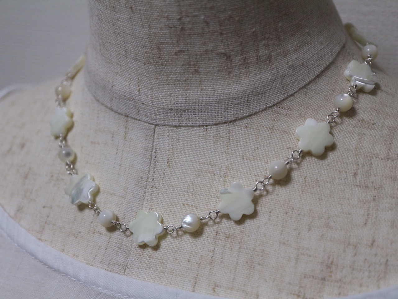 照りの美しいシェル(マザーオブパール)の花形と丸形をワイヤーでつないで作ったショートネックレスです。全長約39センチですが、5センチのアジャスターで44センチまで長くして着けていただくことができます。