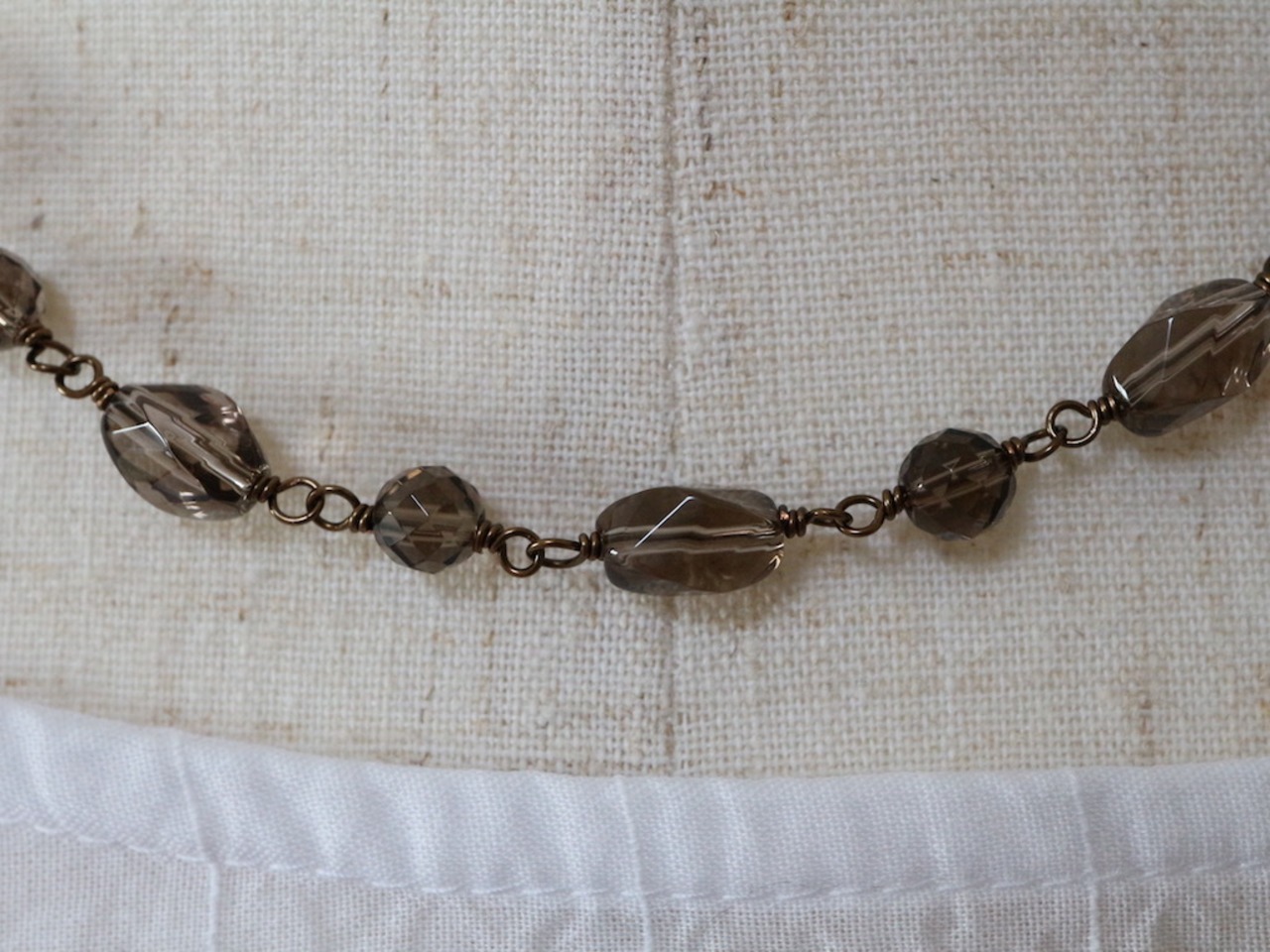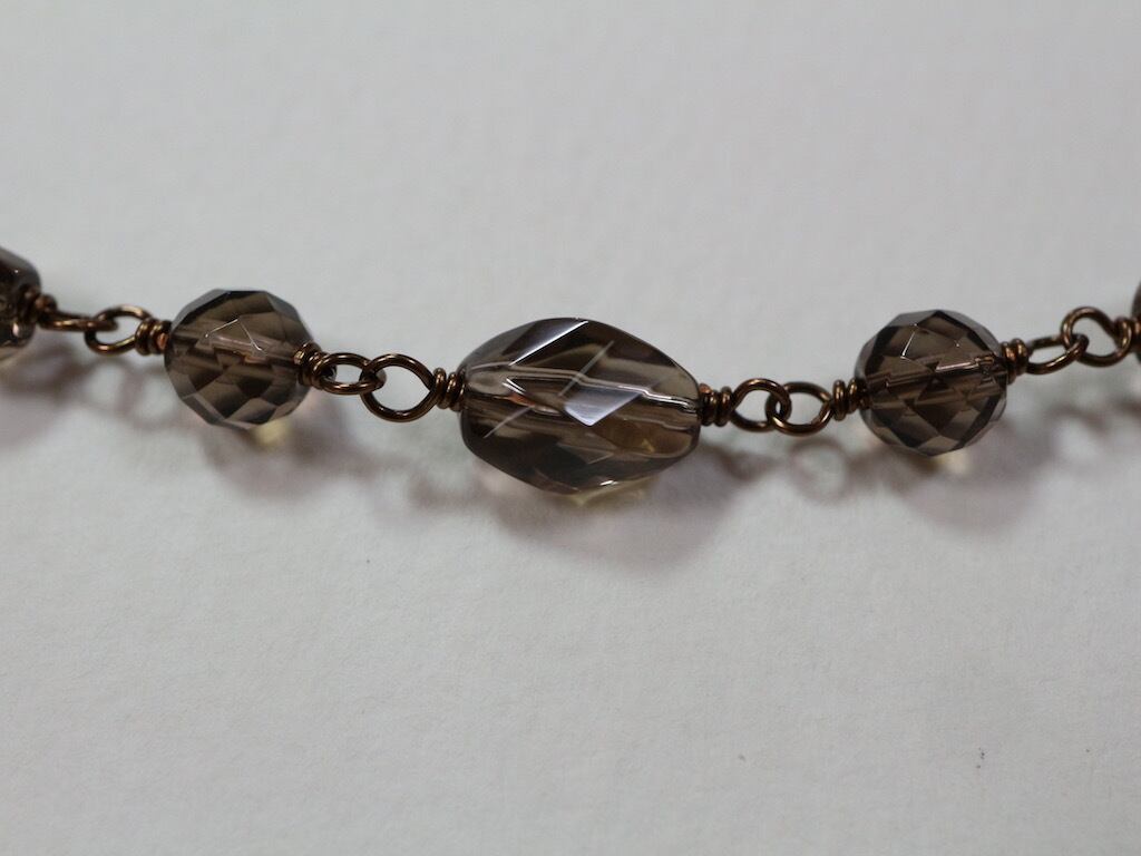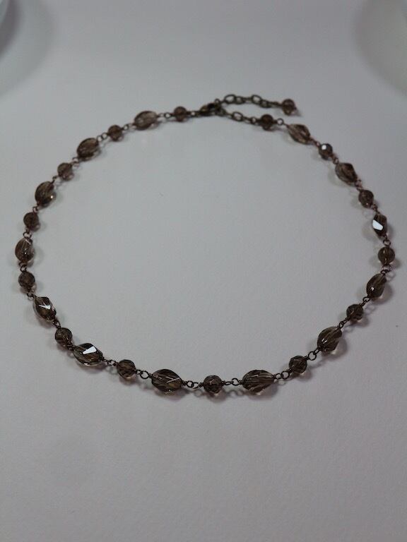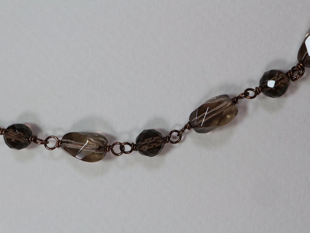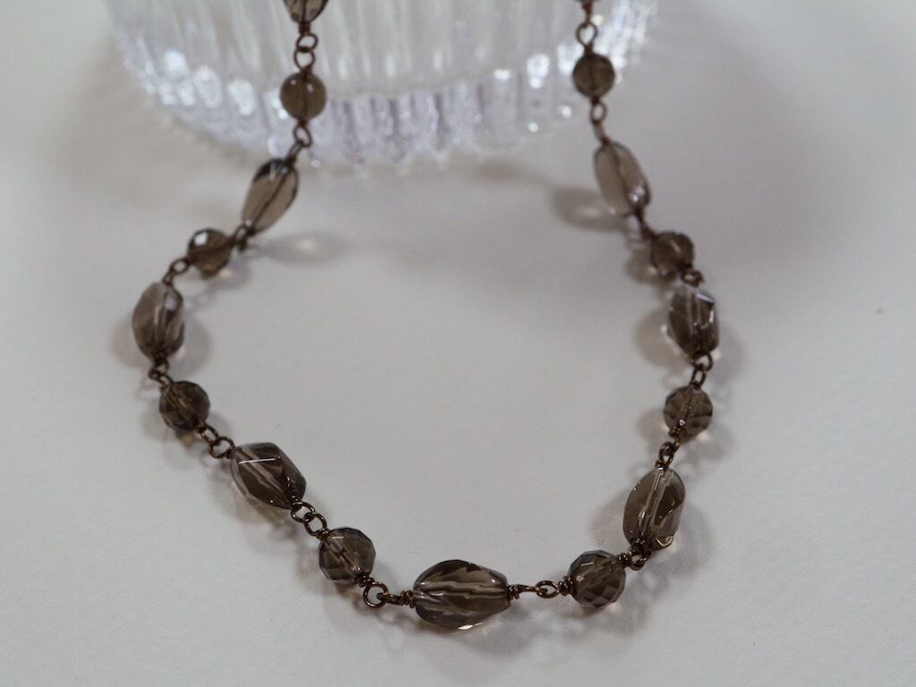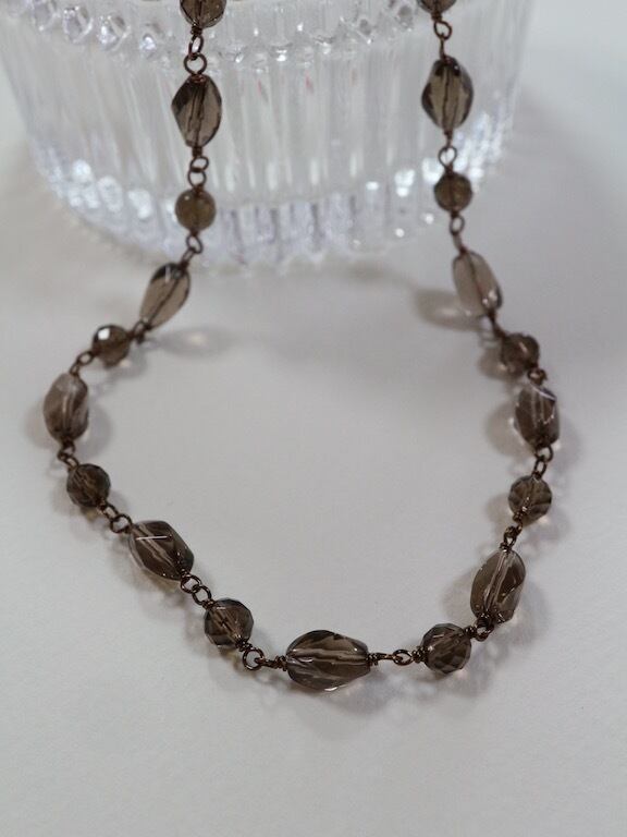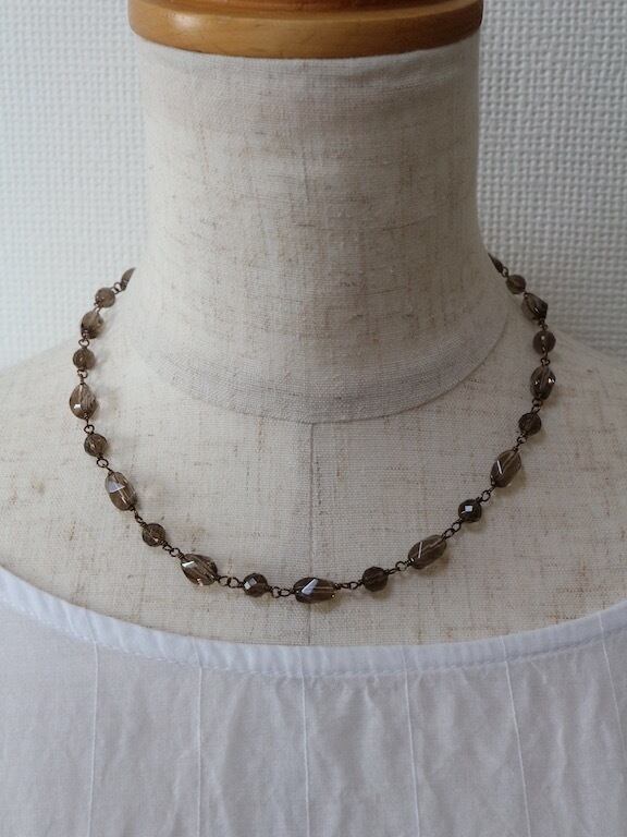 ツイスト形にカットされたスモーキークオーツをつないで作ったショートネックレスです。アクセントに、ツイスト形とツイスト形の間にラウンド形のスモーキークオーツを配置して、ワイヤーでつなぎました(メガネ留め)。