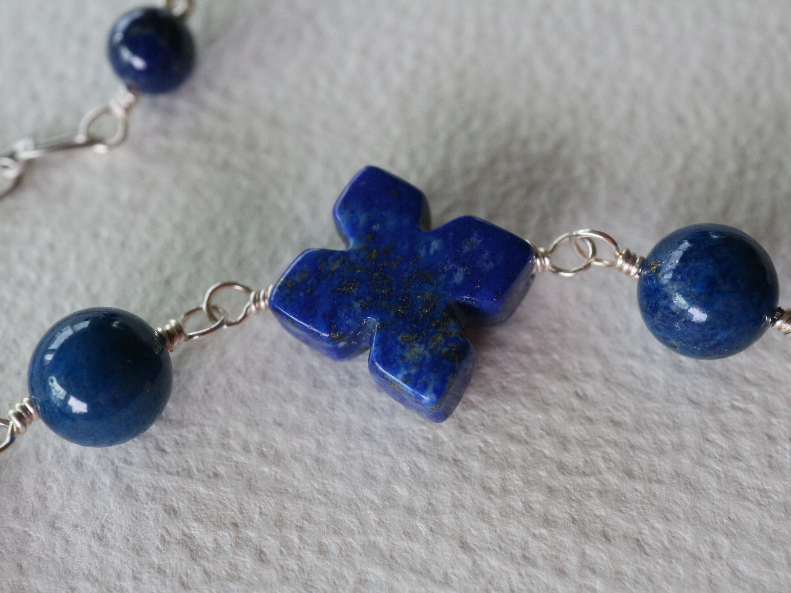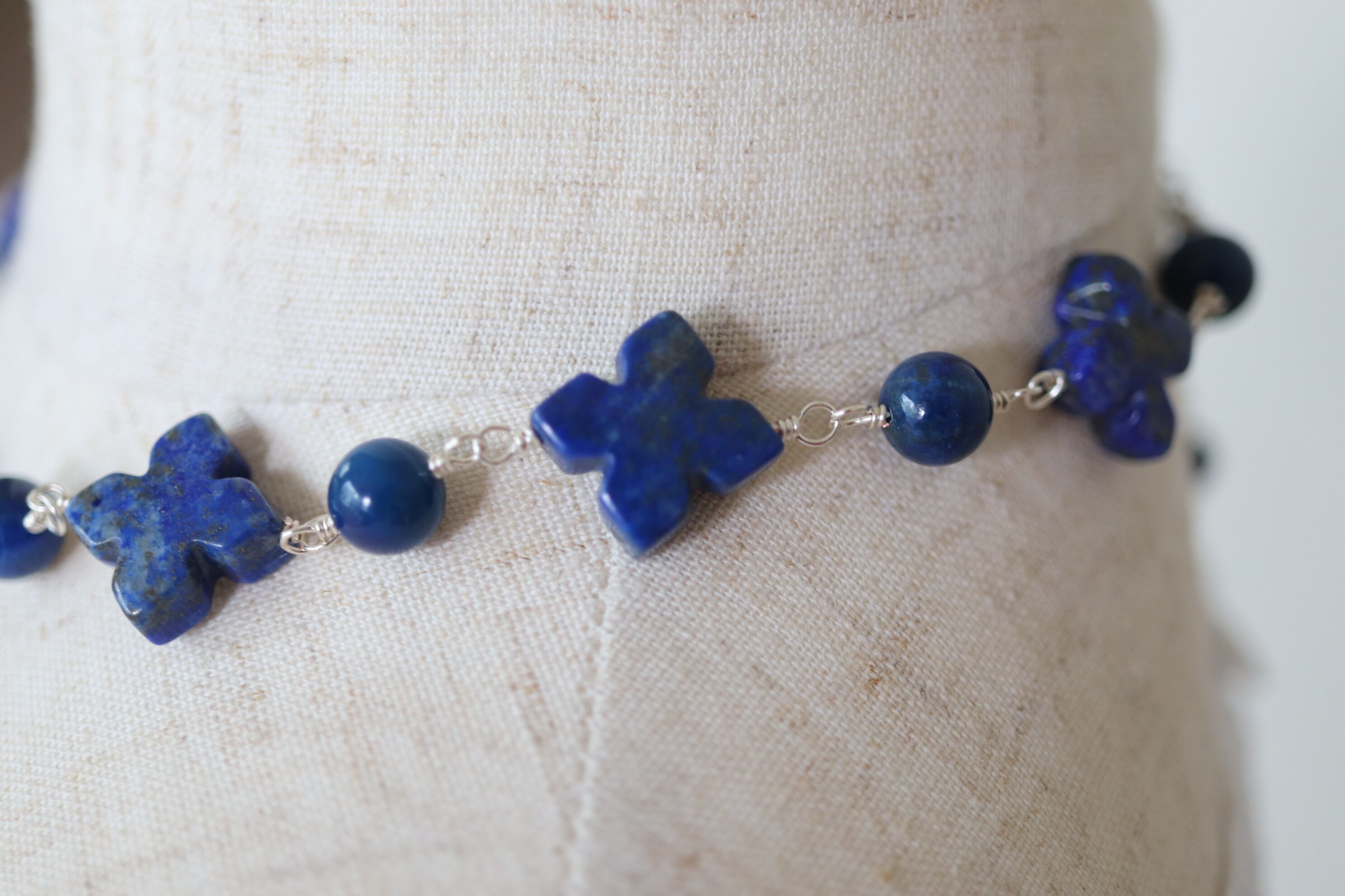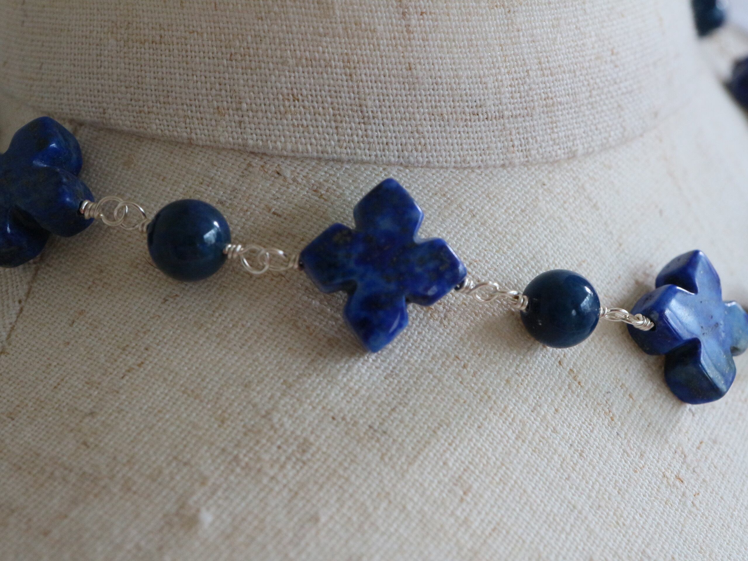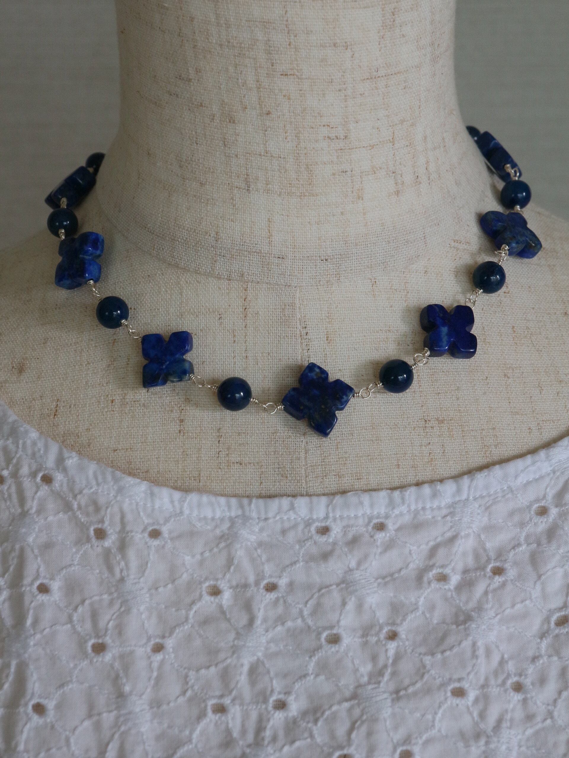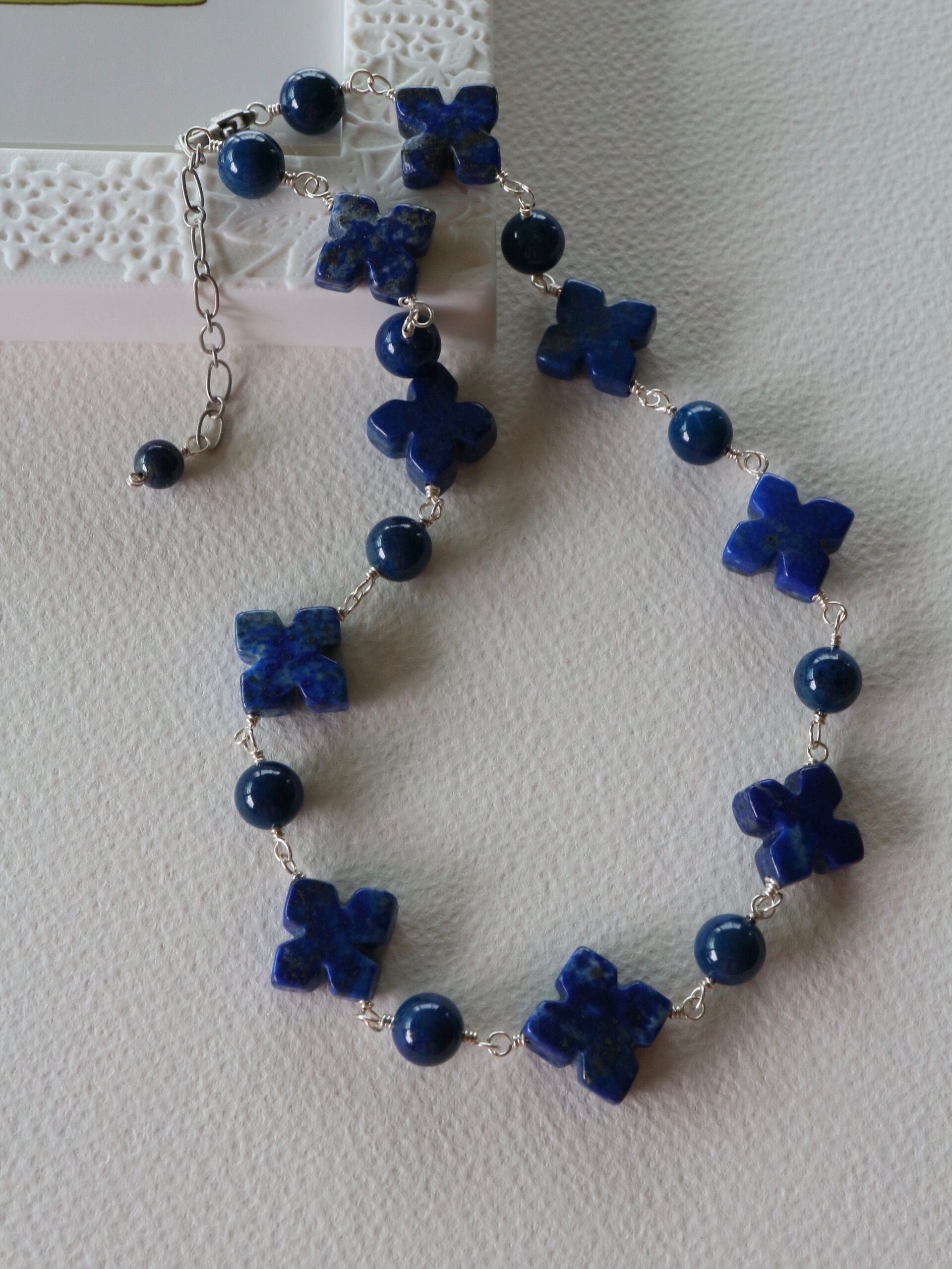 花びら先端がとんがっているタイプの4枚花形と8ミリ丸形のラピスラズリをワイヤーでつないで作ったショートネックレスです。このラピスラズリは、花形・丸形とも、青色の鮮やかな瑠璃色の中に濃紺、ゴールド、白、グレイなどが見えていて、とても神秘的な高品質のものです。