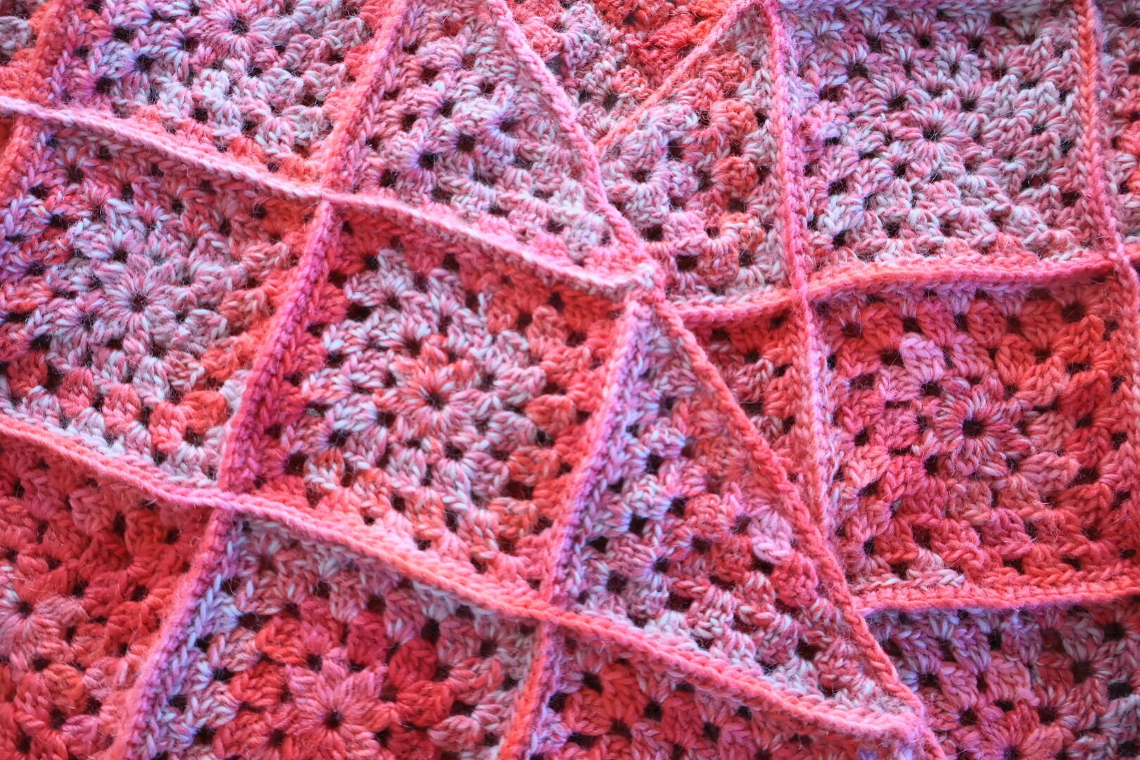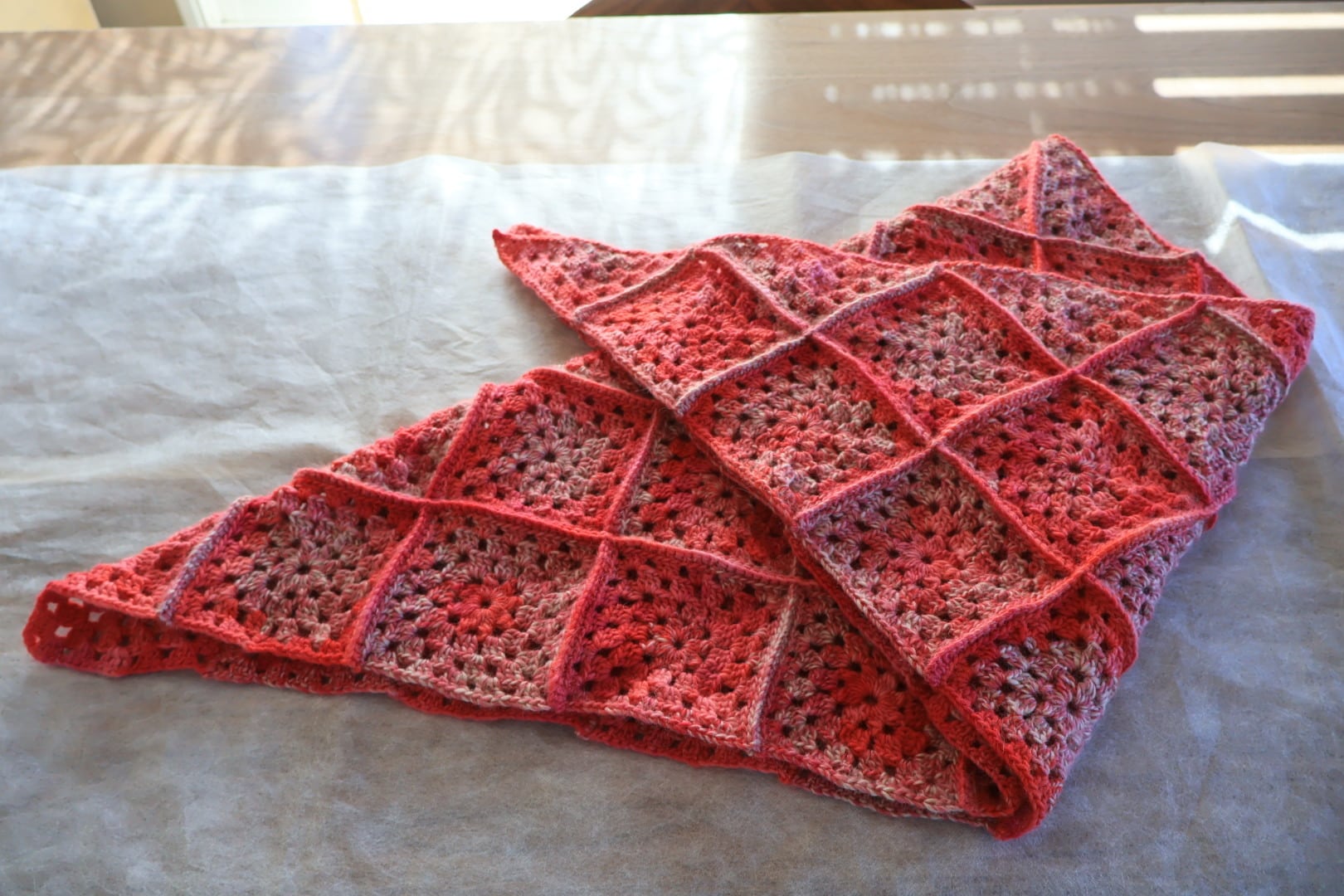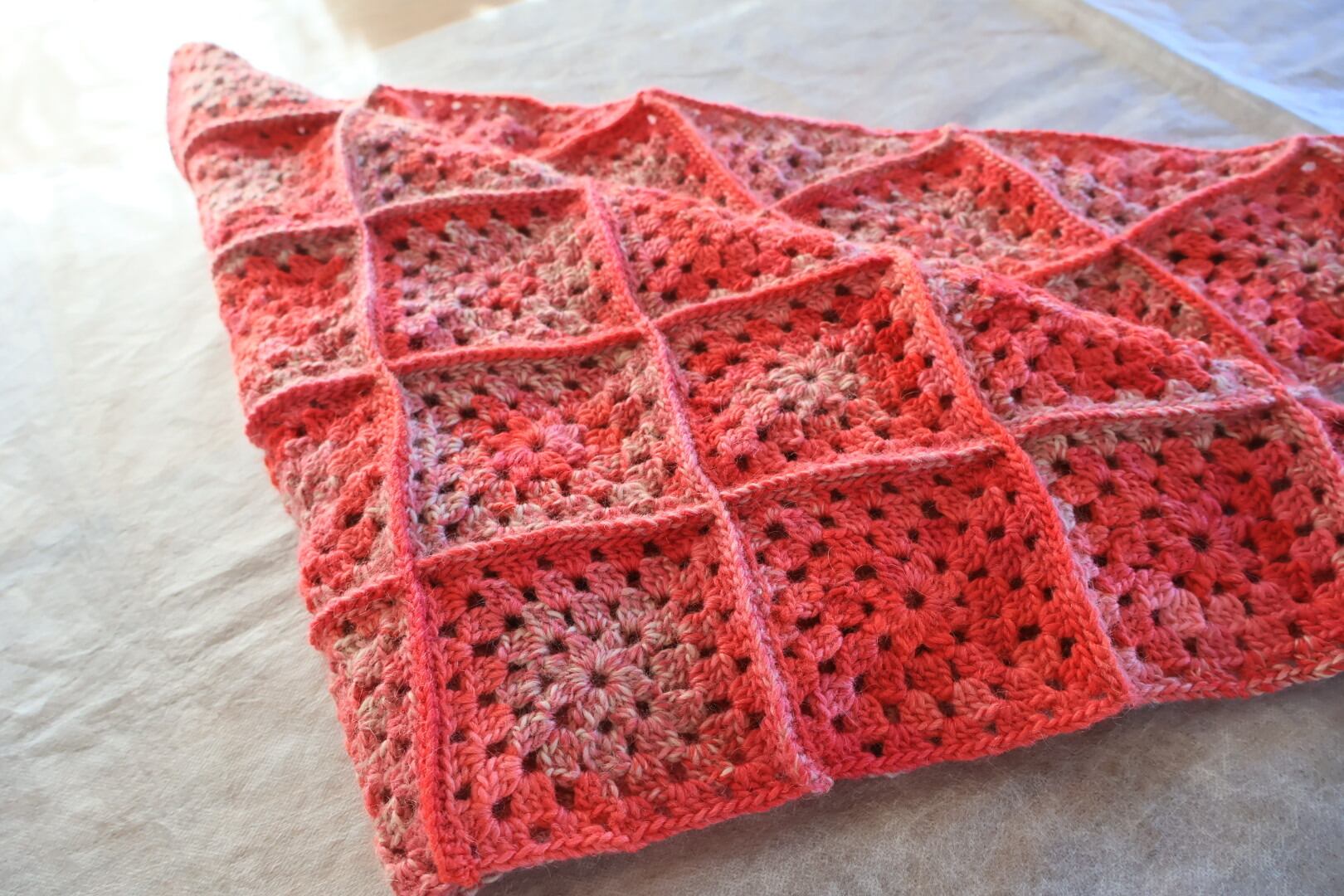 かぎ針編みで、グラニースクエアー編みの技法で編んでいます。