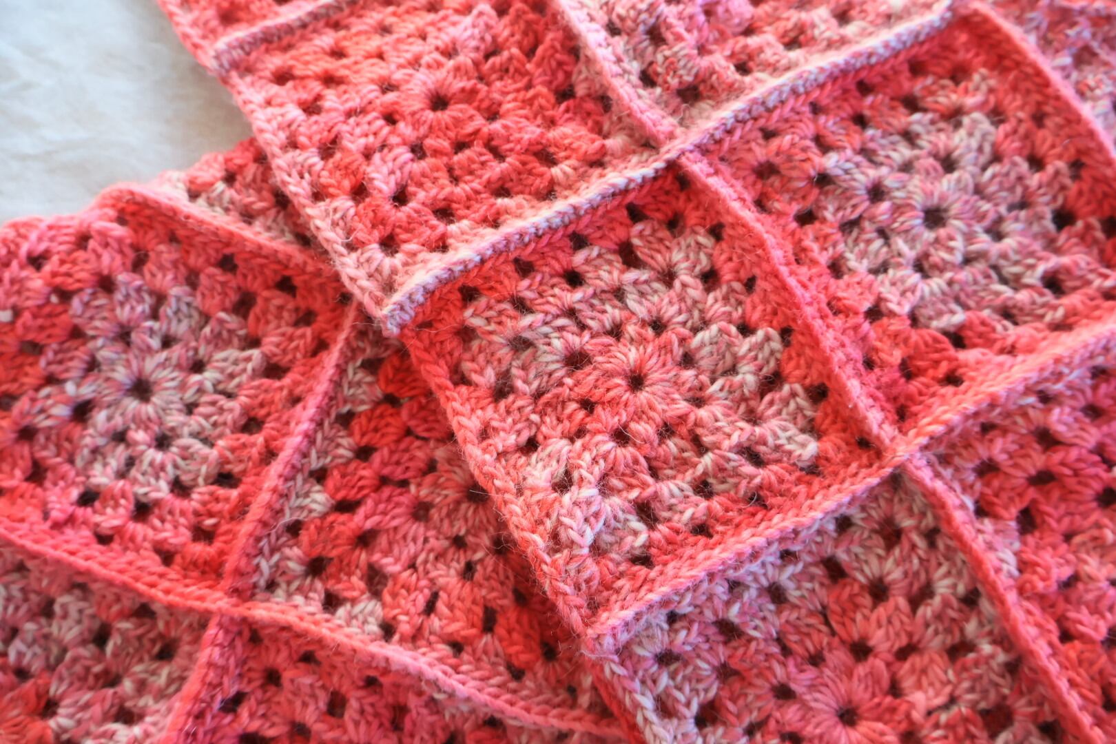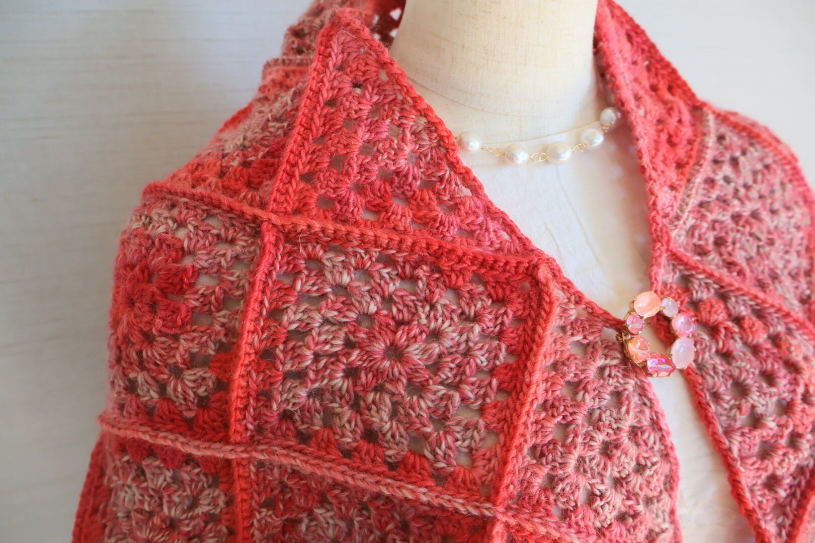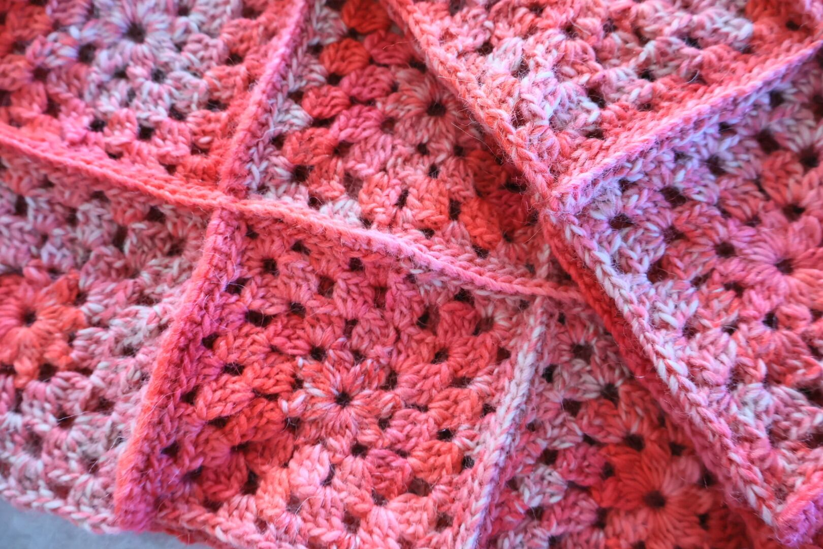 かぎ針編みで、グラニースクエアー編みの技法で編んでいます。