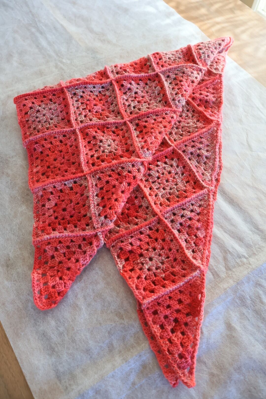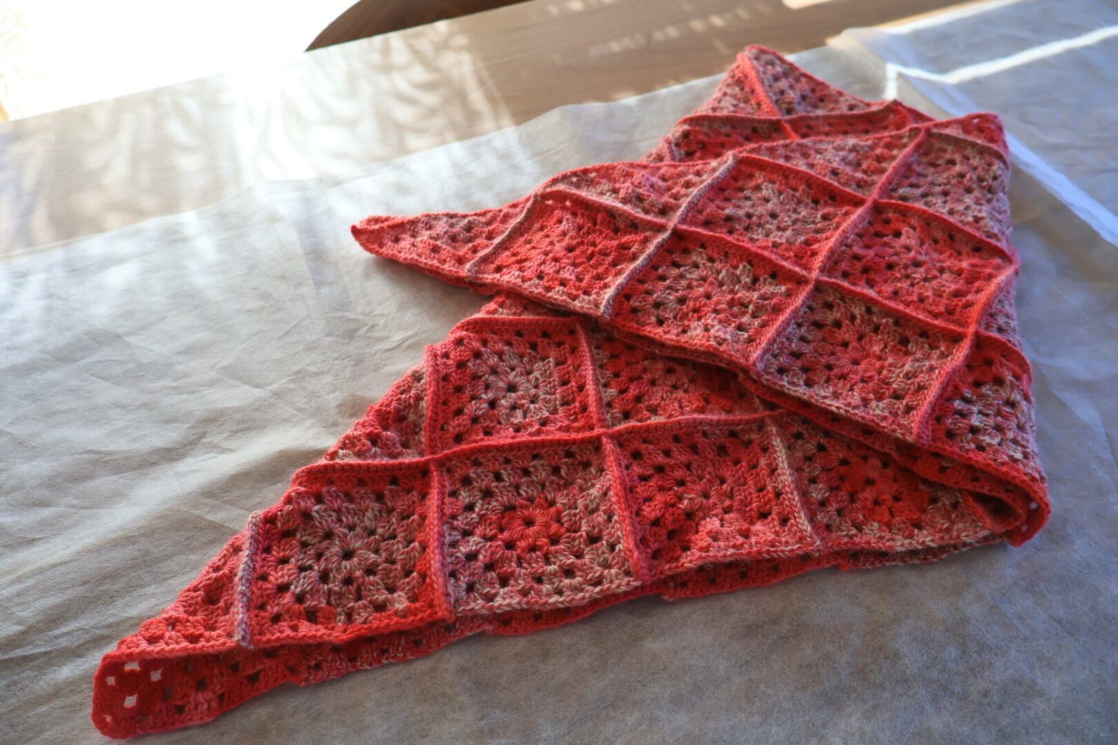 はじめに正方形と三角形のモチーフを編み、最後に編みつないで三角形のショールに仕上げています。