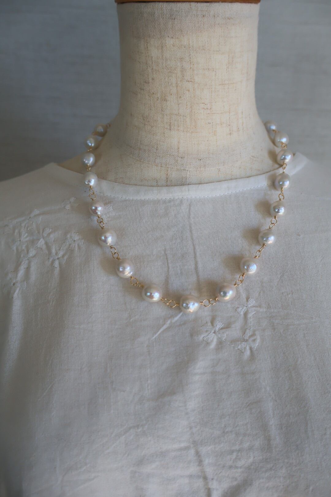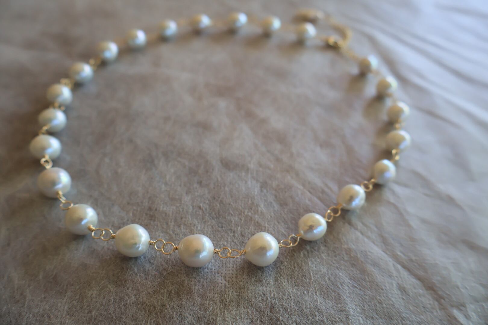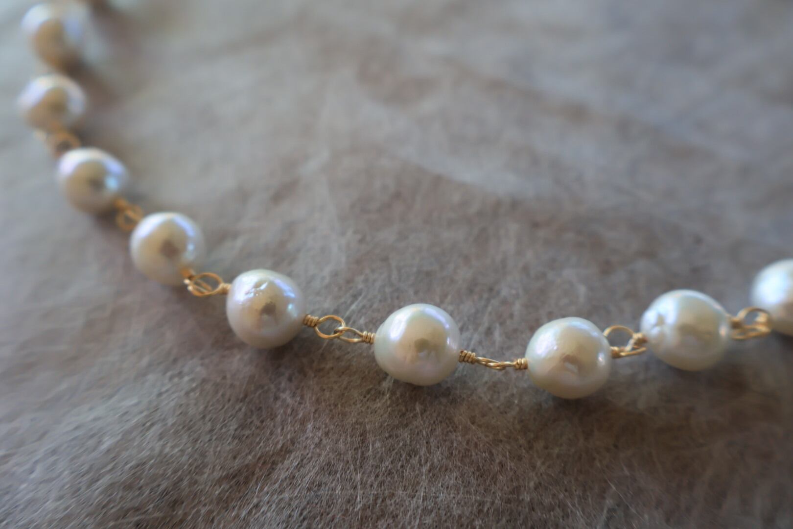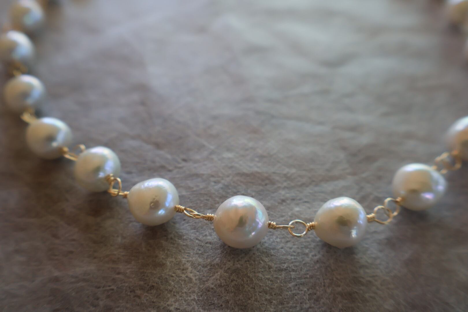 天然の魅力いっぱいの大粒のラウンドパールを、ゴールド色のワイヤーでつないで作ったショートネックレスです。(技法:メガネどめ)