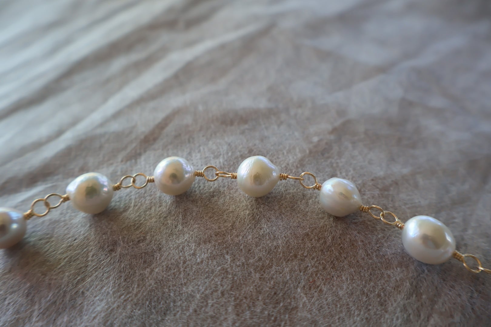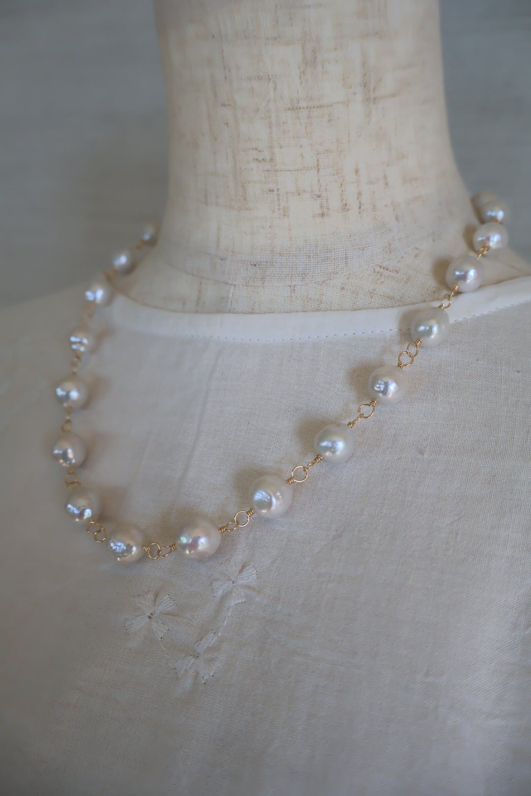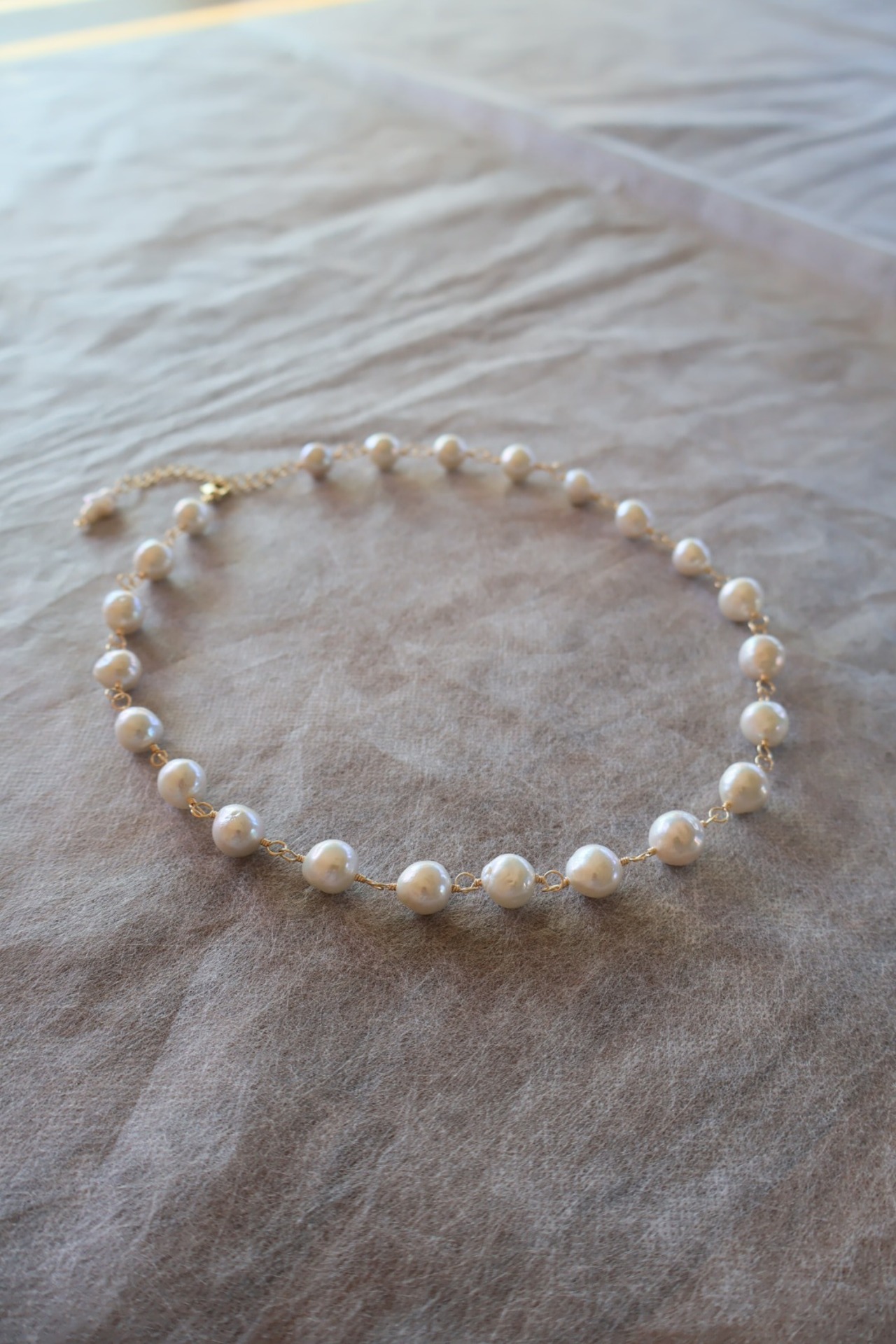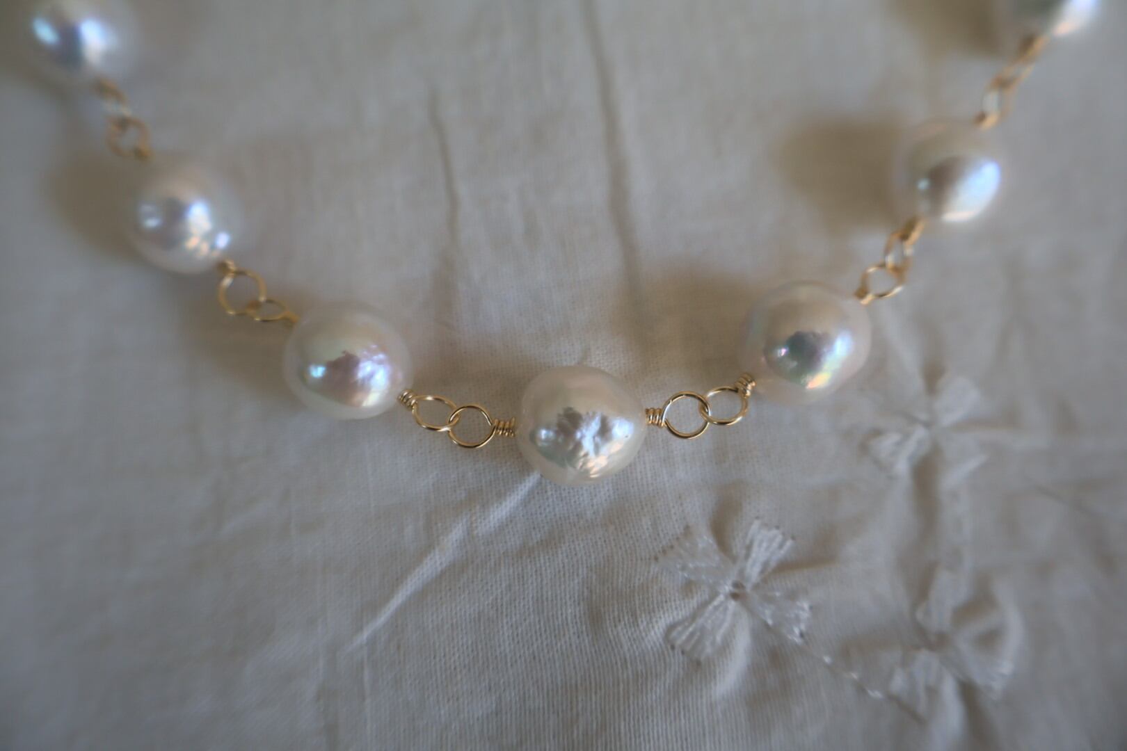 天然の魅力いっぱいの大粒のラウンドパールを、ゴールド色のワイヤーでつないで作ったショートネックレスです。(技法:メガネどめ)