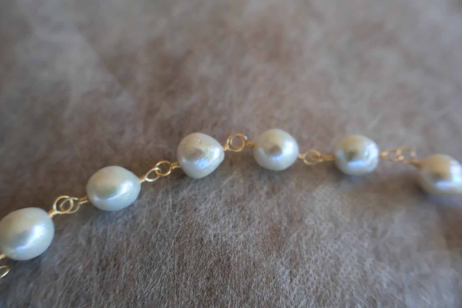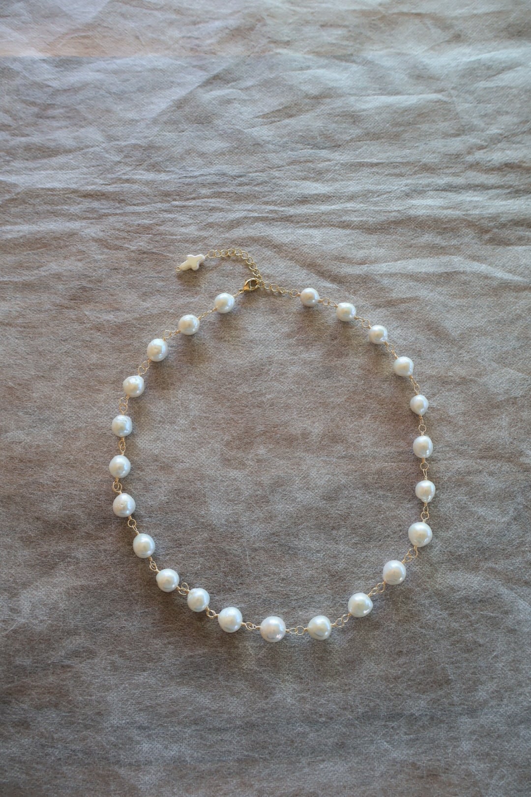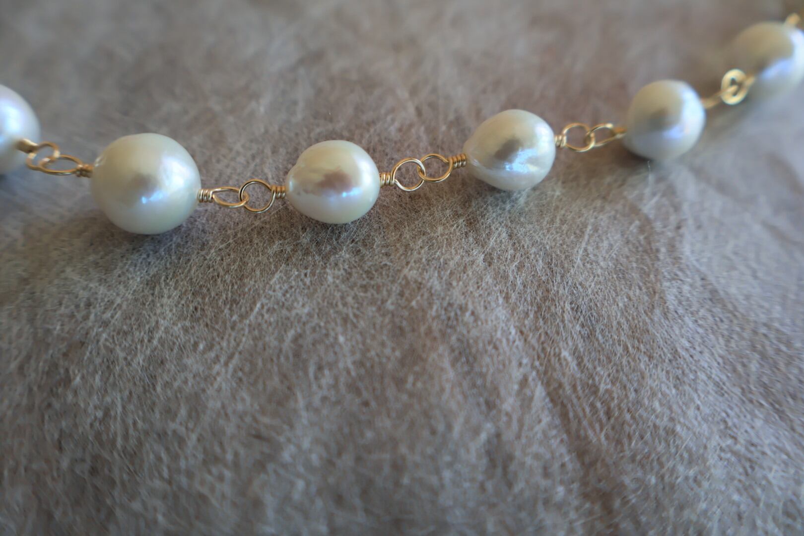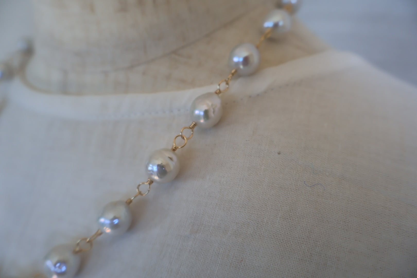 天然の魅力いっぱいの大粒のラウンドパールを、ゴールド色のワイヤーでつないで作ったショートネックレスです。(技法:メガネどめ)