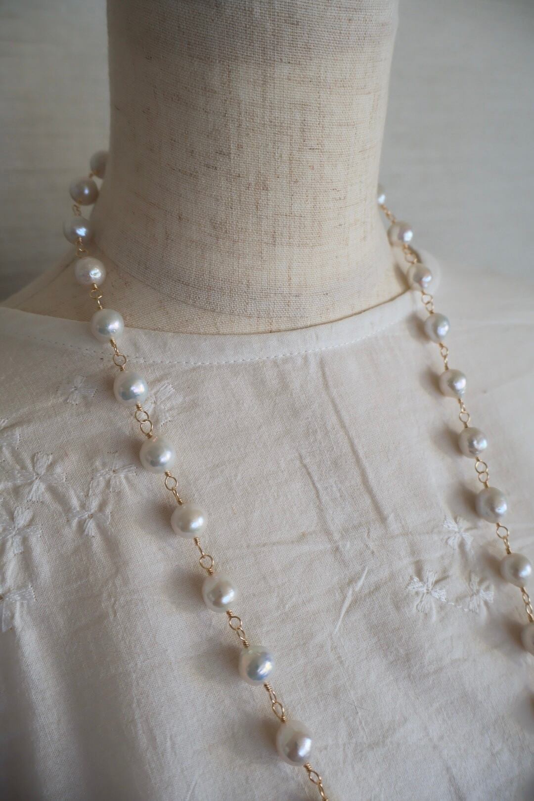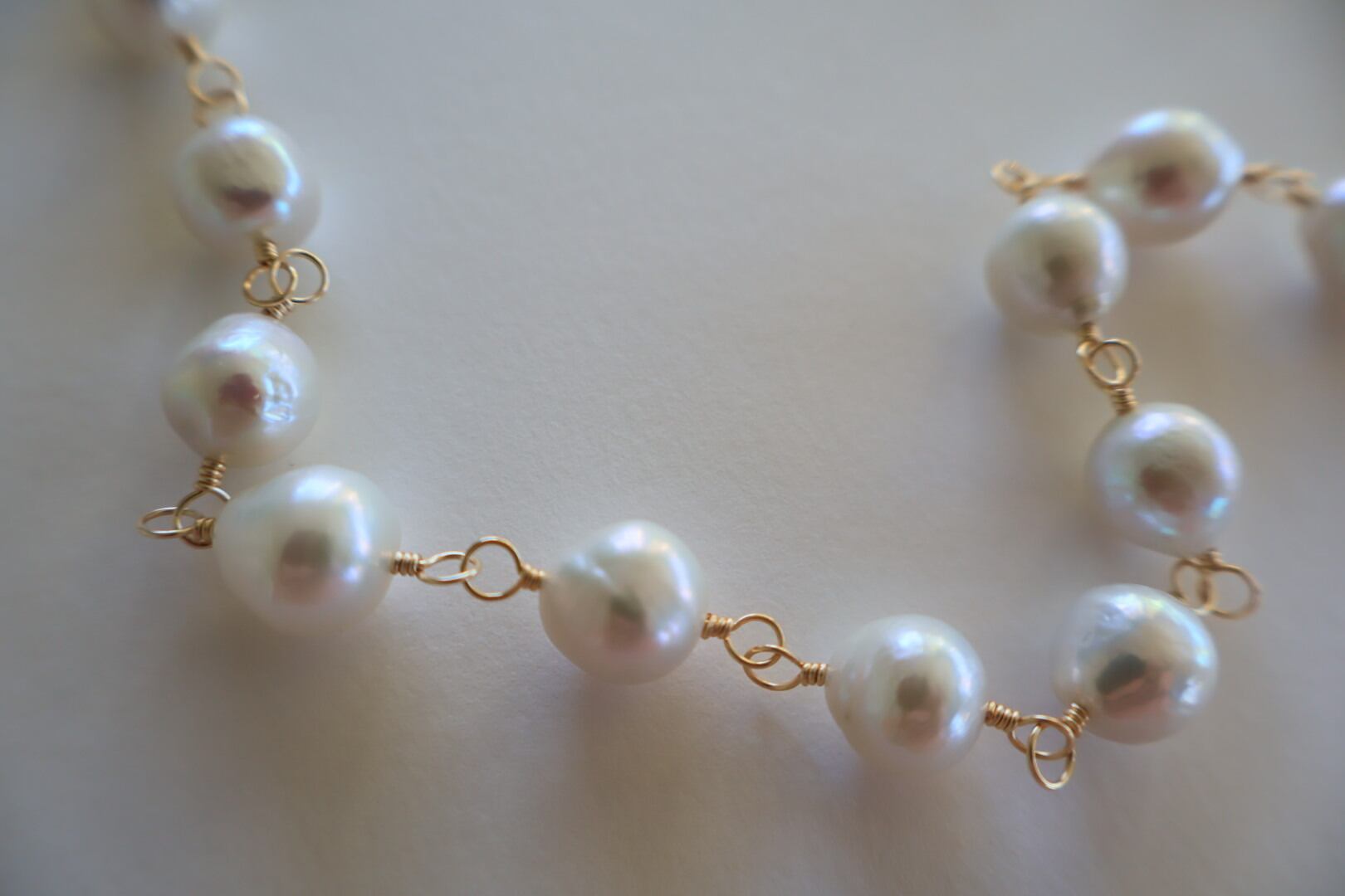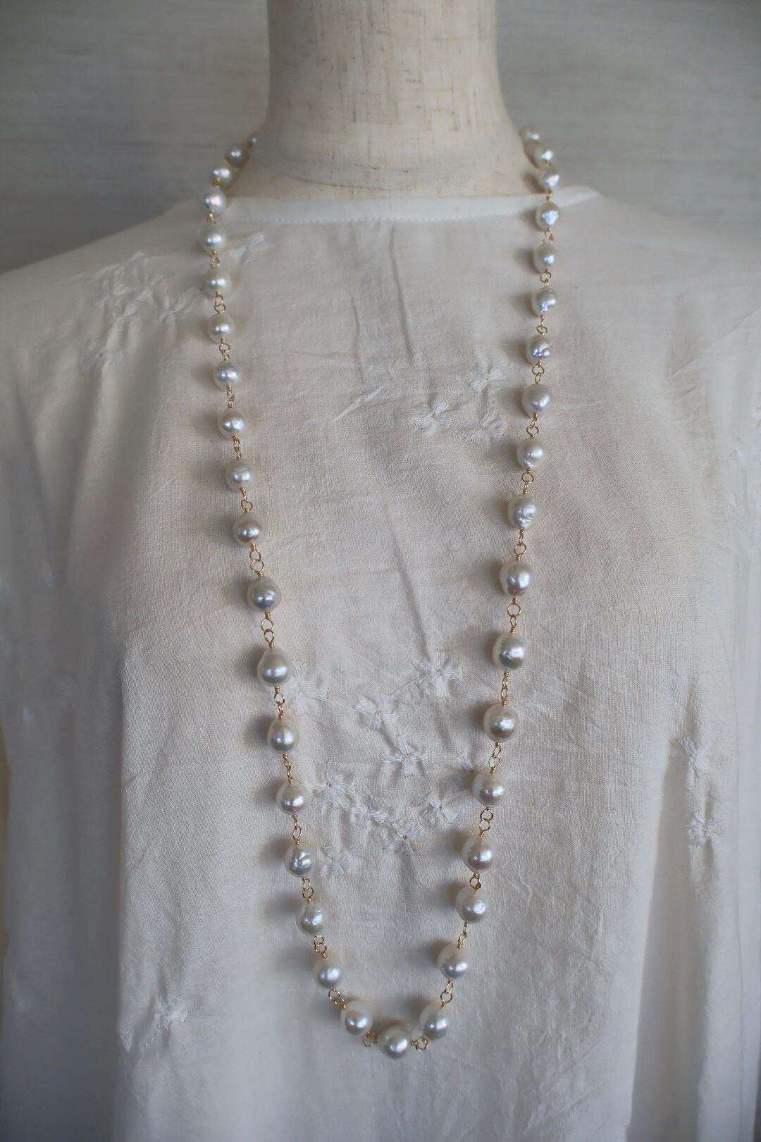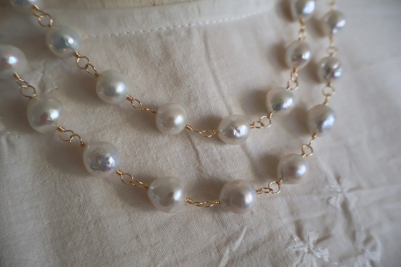 天然の魅力いっぱいの大粒のラウンドパールを、ゴールド色のワイヤーでつないで作ったロングネックレスです。(技法:メガネどめ)
